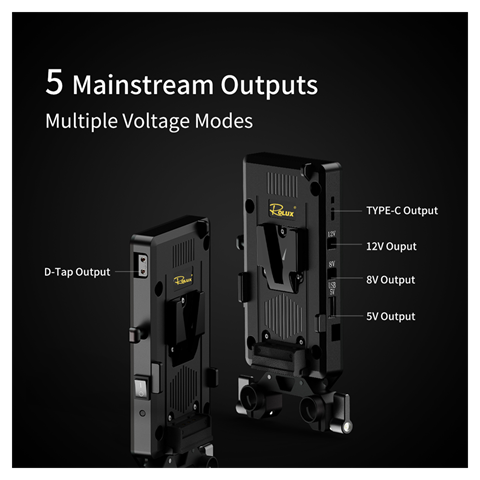 De Rolux RL-VP1 V-Mount Plate is een veelzijdige stroomoplossing met uitgebreide in- en uitgangen. Dankzij de tweeweg Type-C-poort met PD 65W ondersteuning kun je snel apparaten opladen of een V-Mount batterij eenvoudig opladen zonder speciale laders. De plaat biedt 5 gangbare uitgangen: Type-C, D-Tap, 12V DC, 8V DC, en USB-A, geschikt voor smartphones, camera’s, monitoren, verlichting en meer.