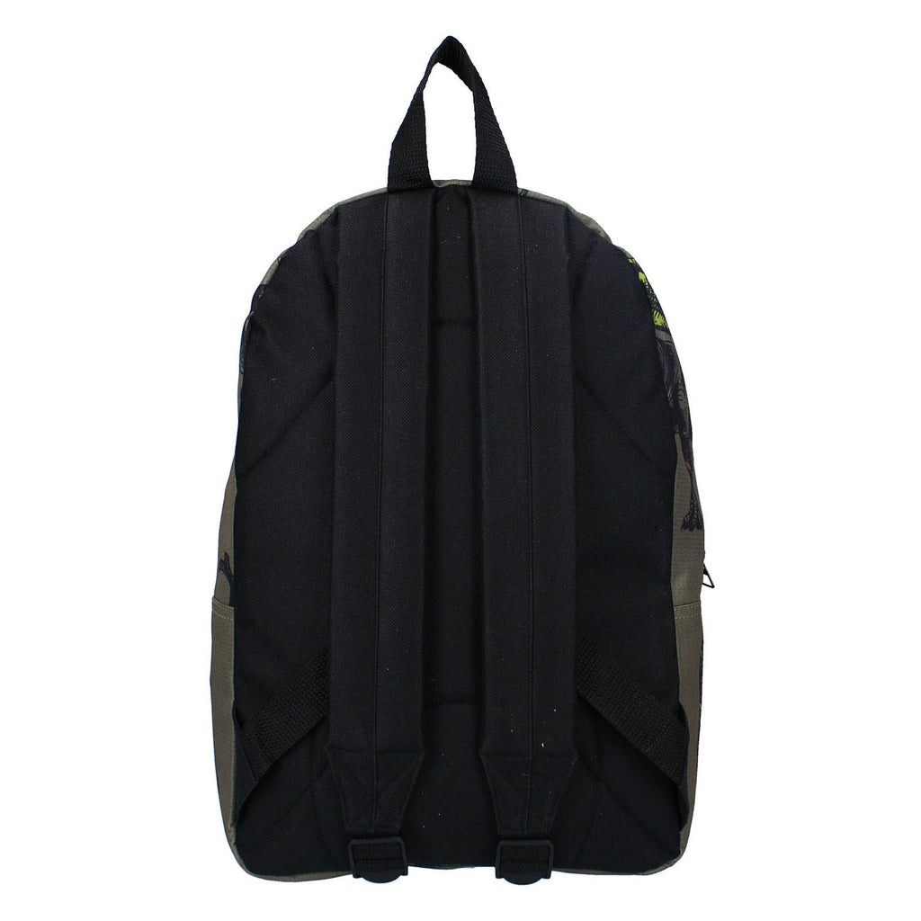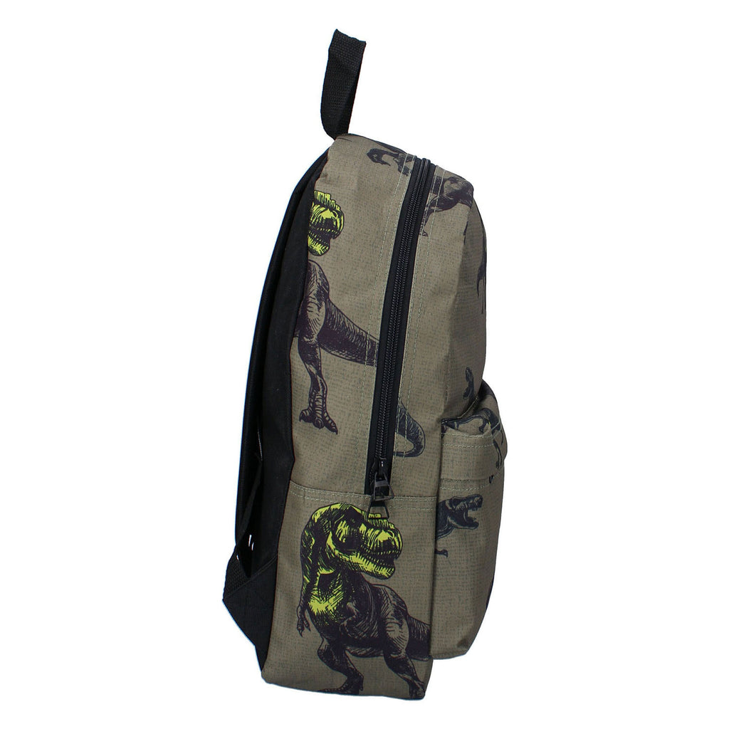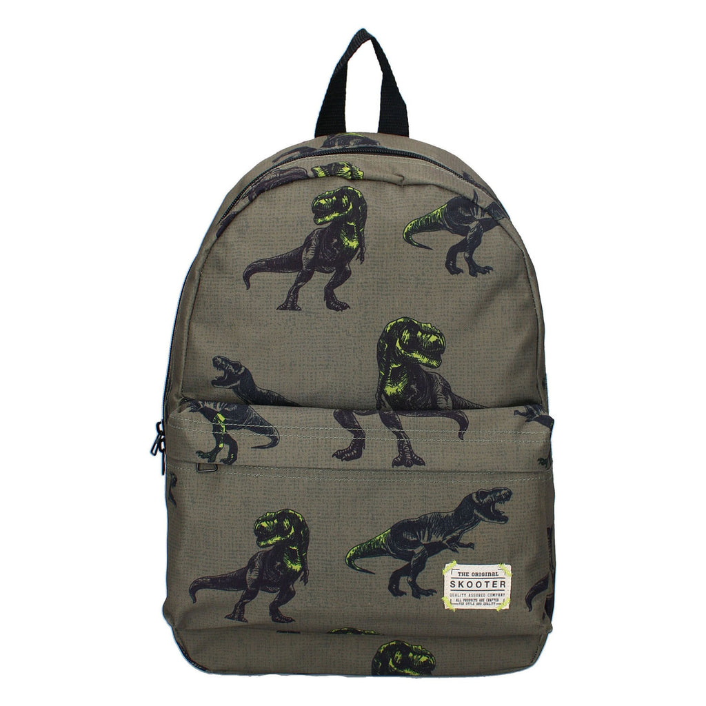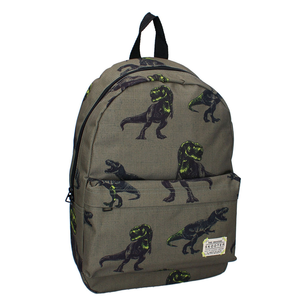 Kijk uit! Deze stoere rugzak van Skooter uit de New Adventures collectie is een echte eye-catcher! Elke jongen wil wel gezien worden met deze tas. De stoere dino's staan afgebeeld op de donkergroene print van de tas. Daarnaast zitten er verschillende patches op de rugzak. Het ruime hoofdvak biedt genoeg plek voor een laptop, schoolboeken en schrijfwaren. In het grote voorvak kun je onder andere jouw portemonnee, telefoon en sleutels kwijt! Door middel van de verstelbare schouderbanden heb je veel draagcomfort. Tevens is de tas aan de bovenzijde, door middel van de lus, ook eenvoudig te dragen.