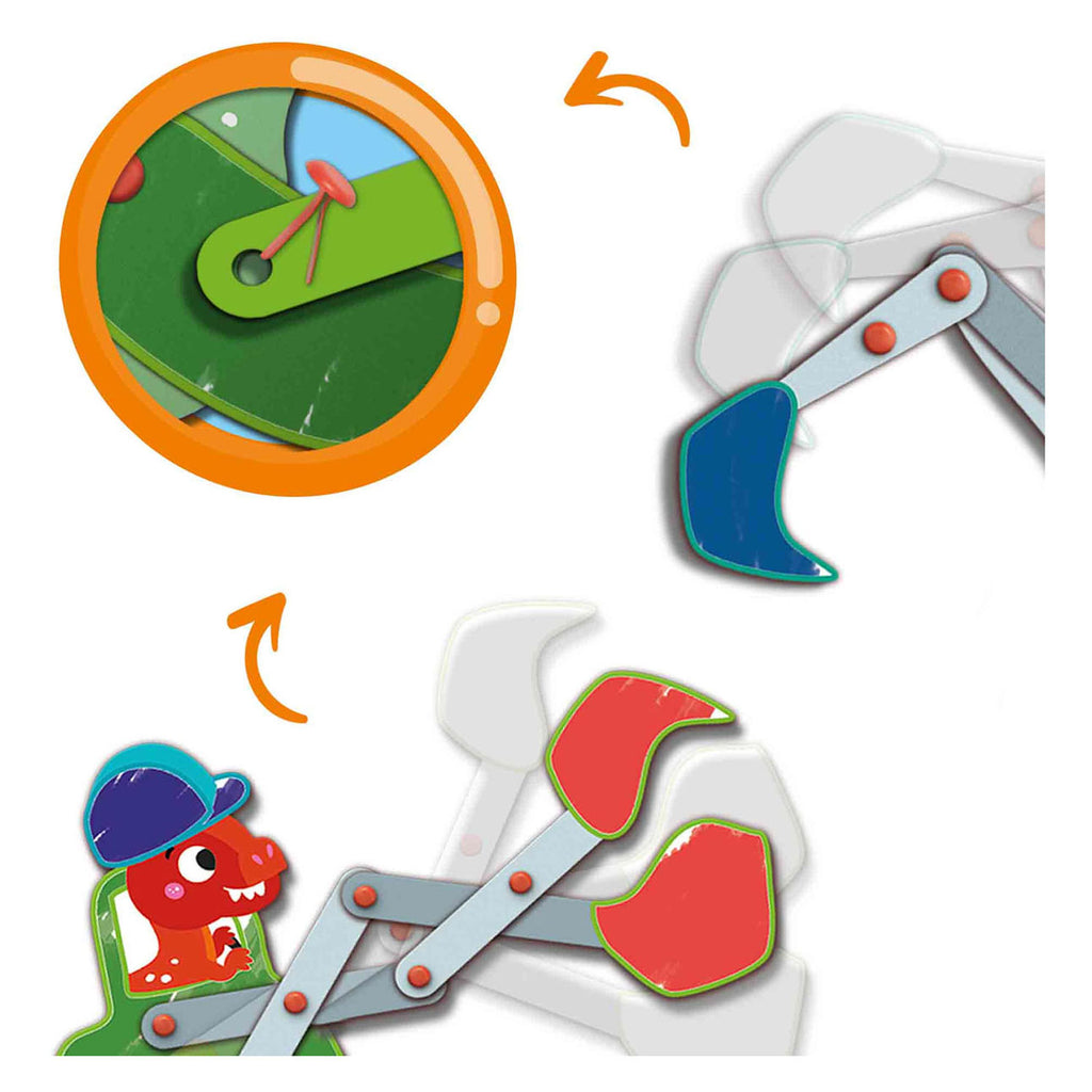 Jonge ingenieurs opgelet! Met deze papier constructieset van SES Creative kunnen kinderen knutselen, ontdekken en hun technisch inzicht ontwikkelen. Kinderen kunnen de onderdelen inkleuren met de viltstiften en vier echt bewegende dino's en bouwvoertuigen in elkaar zetten met splitspennen. Draai aan het tandwiel of beweeg een as, en kijk wat er gebeurd! Het werkt echt!