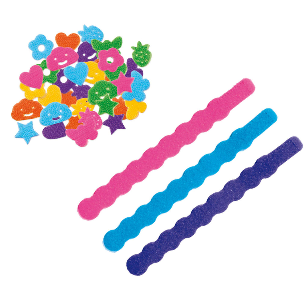 Met de SES 14803 kun je gemakkelijk je eigen armbanden versieren. Het klittenband kan worden gedecoreerd met vormpjes in verschillende kleuren. Dankzij het handige klittenbandsysteem kunnen de vormpjes en armbanden steeds opnieuw worden gebruikt.