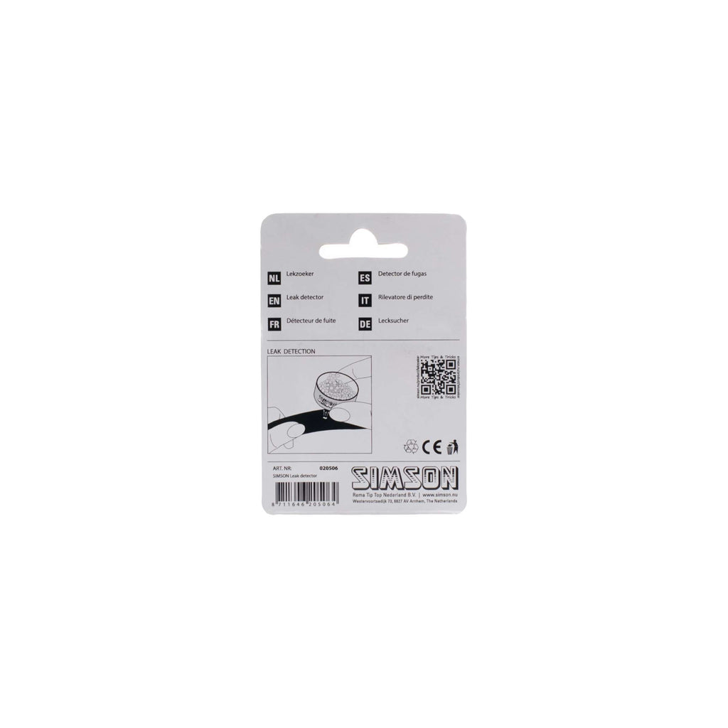De Simson lekzoeker is een handige tool om snel het gat in de band te vinden, zonder het gebruik van water. Door zijn compacte formaat is de lekzoeker ook handig voor onderweg. Beweeg met de lekzoeker over de binnenband, en de piepschuimen balletjes komen in beweging door de luchtstroom bij lekkage.