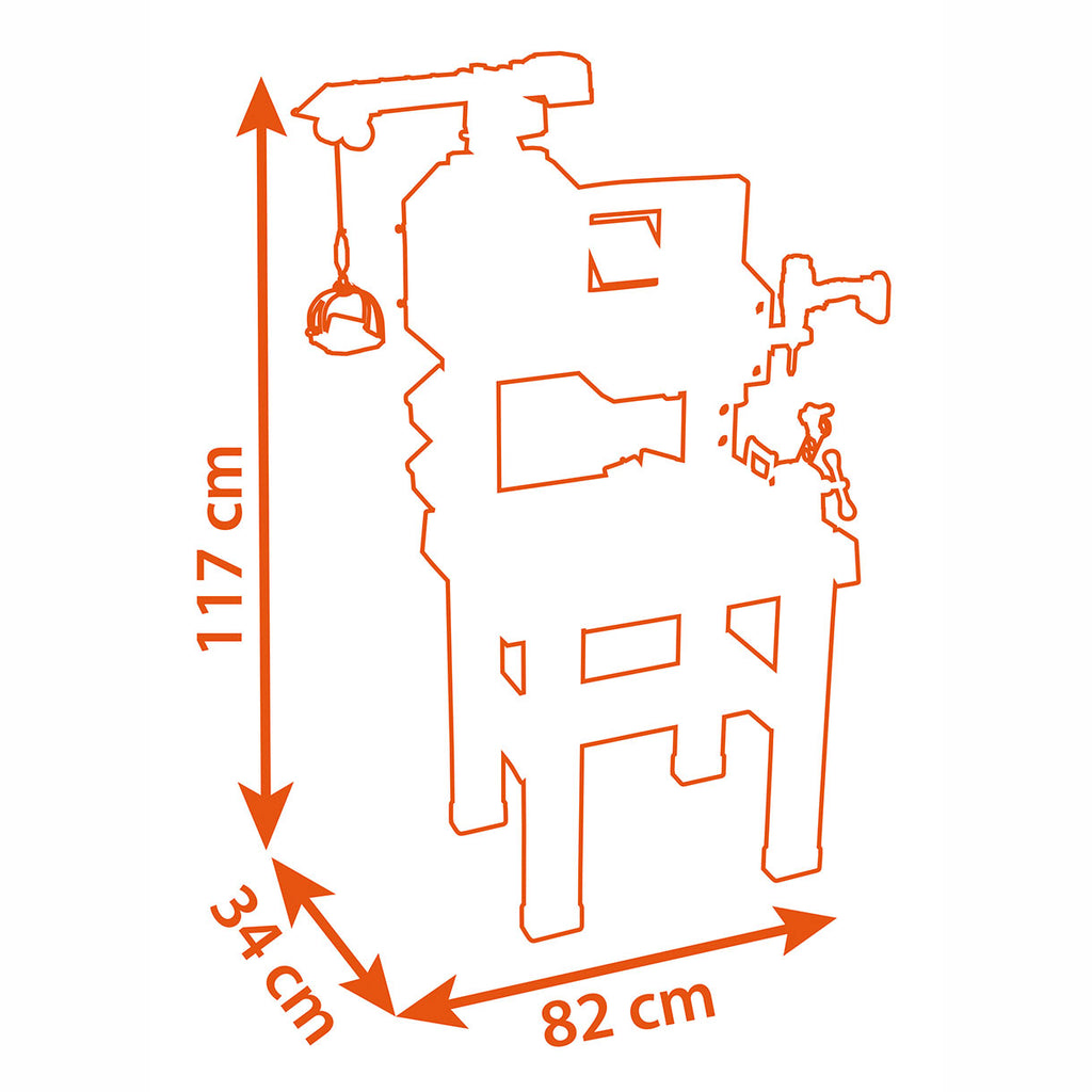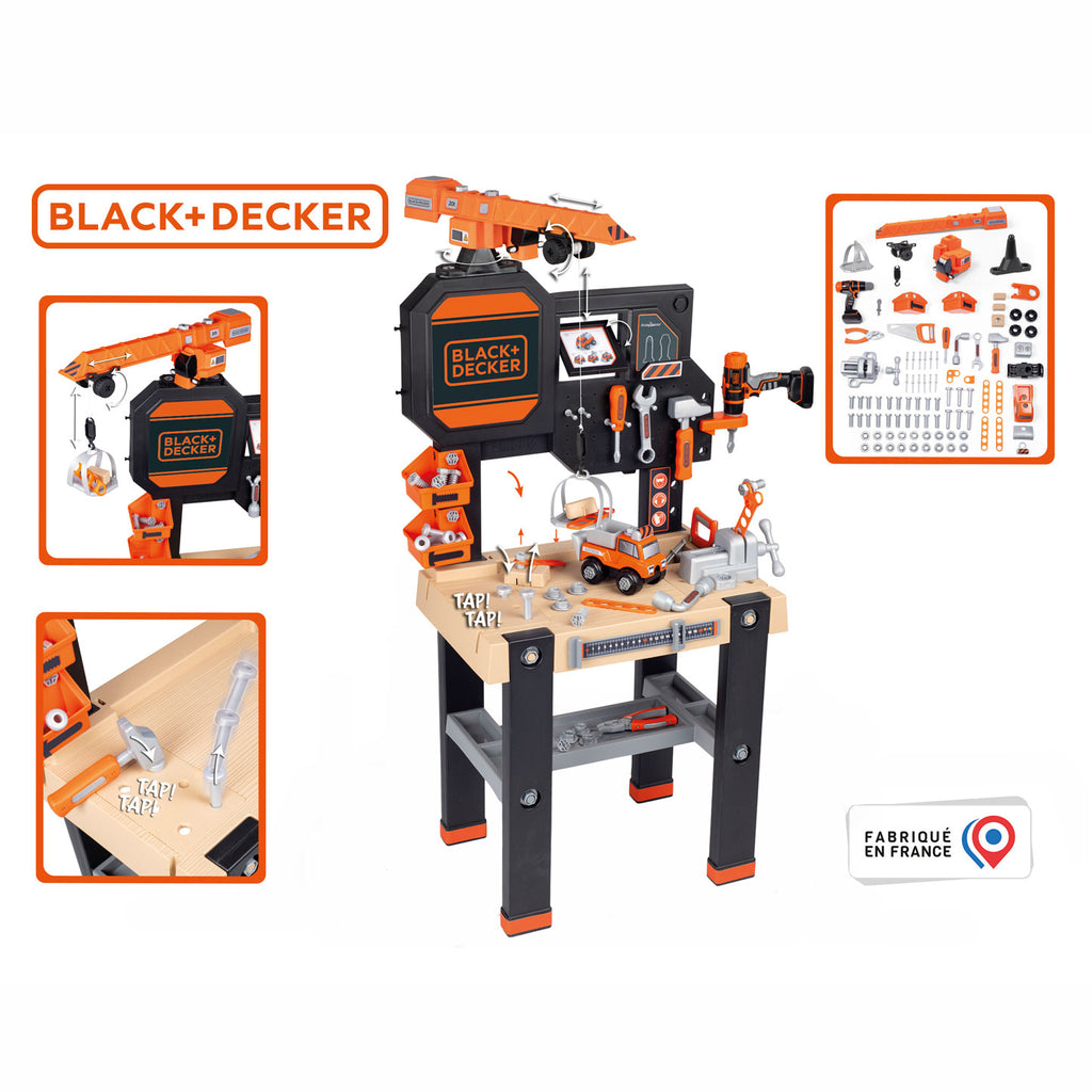 • Black & Decker werkplaats • Inhoud: werkbank met meer dan 94 accessoires, waaronder zeven gereedschappen (zaag, hamer, gewone sleutel, schroevendraaier, tang, elleboogsleutel, gereedschap voor bankschroef) plus een bewegende kraan, mechanische boor, schroeven, moeren, spijkers, constructieplanken, mechanische liniaal, opbergbakken en compartimenten plus materialen voor twee te bouwen voertuigen. • Afmeting: 117 bij 82 bij 34 centimeter. • Geschikt voor kinderen vanaf 3 jaar oud. • Gemaakt van kunststof.