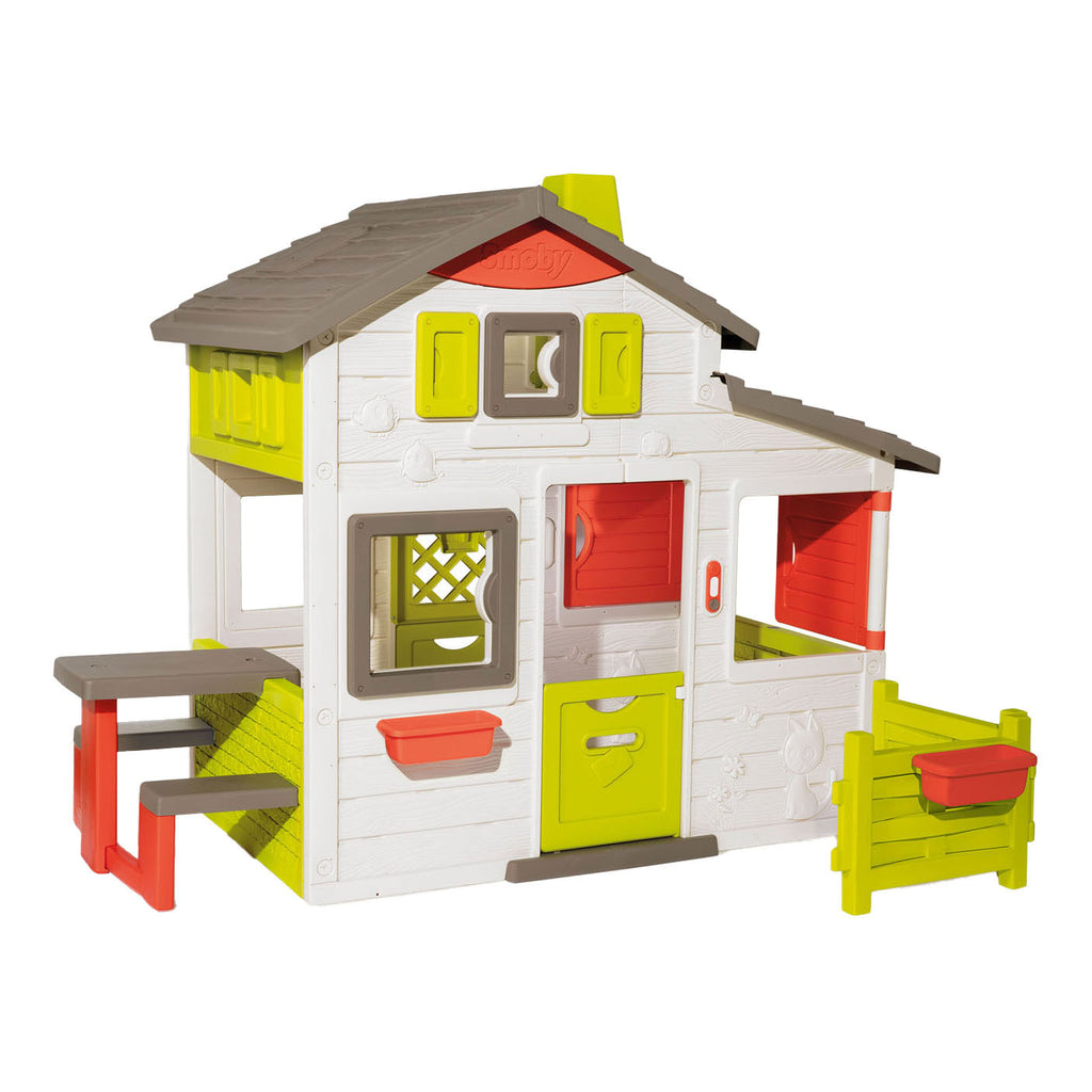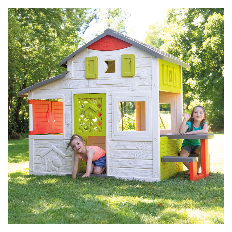 . Uitgebreid met extra tuingedeelte en picknickbankje. Details • Afmetingen van het speelhuisje: 98 bij 110 bij 127 centimeter. • Gemaakt van kunststof. • Kleuren: wit, bruin, lichtroze en donkerroze. • Geschikt voor kinderen van 2 tot 6 jaar oud. • Gemaakt in Frankrijk.