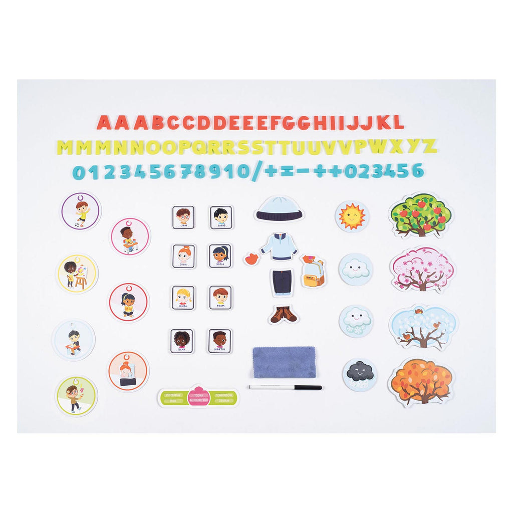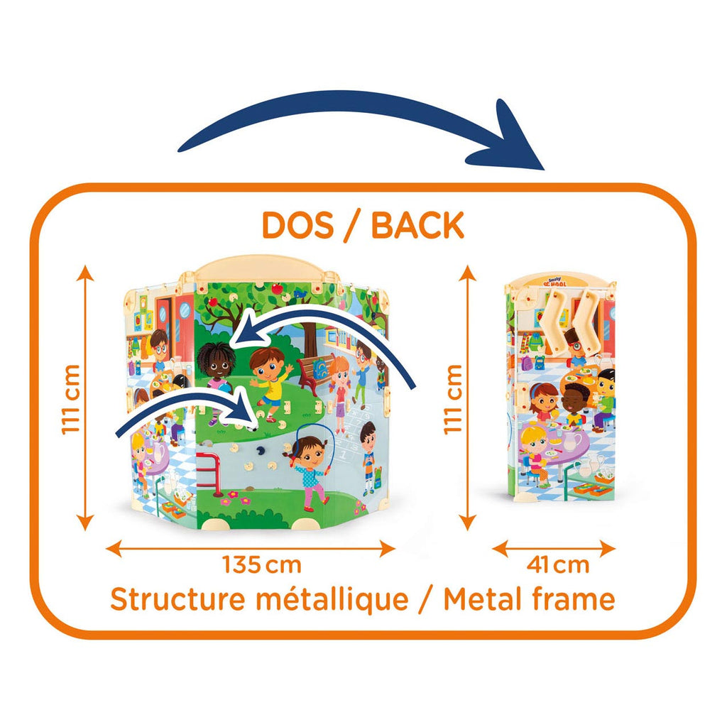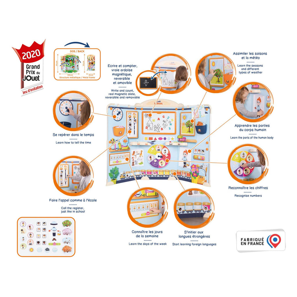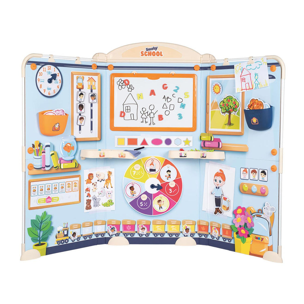 Speelschooltje van Smoby met whiteboard en krijtbord: - Drieluik die makkelijk op te bergen is na gebruik. - Inclusief kaarten om te ondersteunen bij de les, 72 letters en cijfers, uitwisbare stift, krijtbord, magnetische cijfers en letters. - Afmetingen: 135 x 41 x 111 cm - Geschikt voor 3 jaar en ouder.