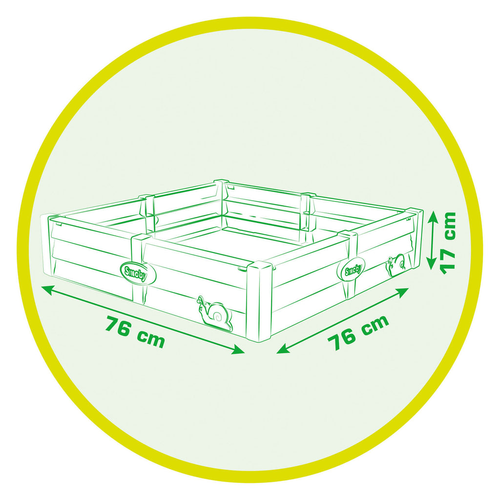 Tuinbak van Smoby die te gebruiken is als zandbak of tuintje voor kinderen. Inhoud: 75 kg zand of 60 l tuinaarde. De kunststof tuinbak is 76x76 centimeter groot en wordt geleverd met bodemzeil. Geschikt vanaf 2 jaar.
