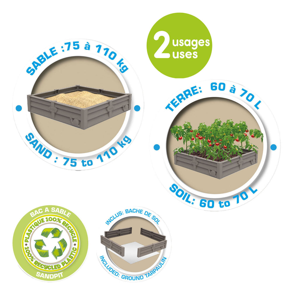 Vierkant speelhuisje van Smoby met bijbehorende tuinbox voor het maken van een zandbak of tuintje. Gemaakt van stevig kunststof met anti-UV. Inclusief bodemzeil. Geschikt vanaf 2 jaar.