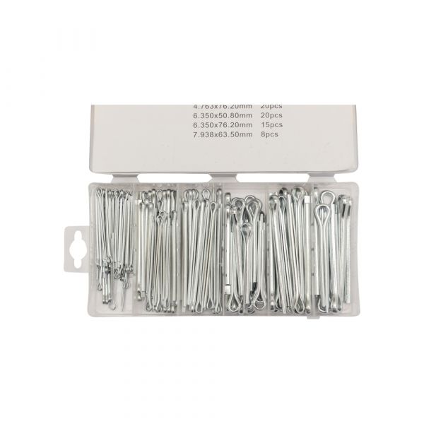 Een ruime doos met diverse veelvoorkomende maten splitpennen. Deze assortiment splitpennen bevatten in totaal 144 delen: