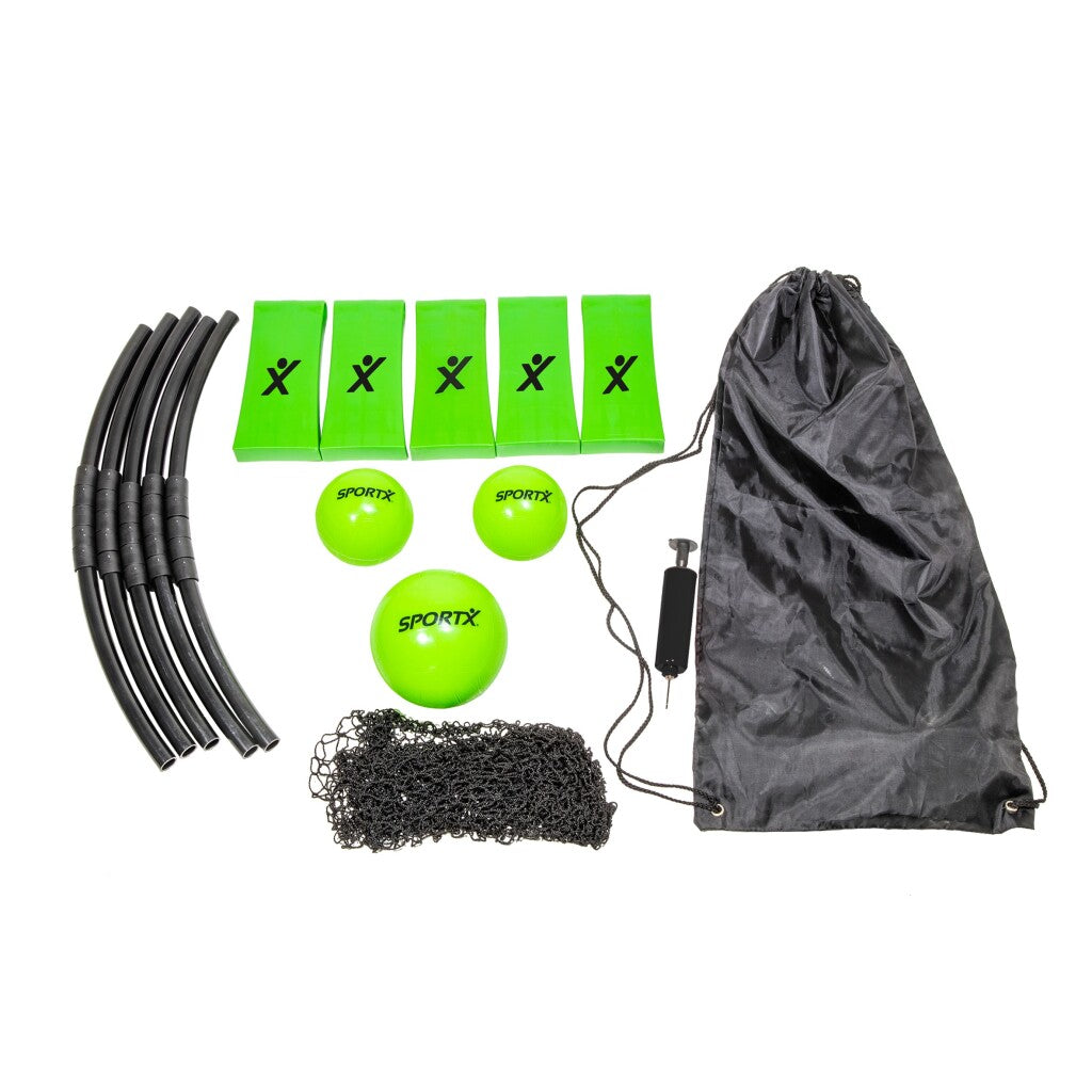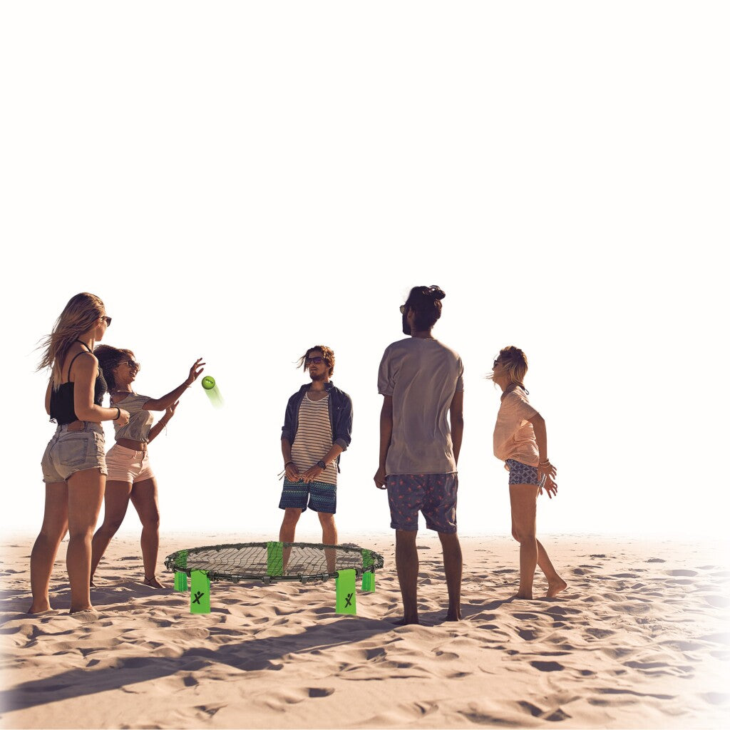 Begin het spel door de bal met de hand op het net te slaan in de richting van de tegenstander. Elk team mag de bal maximaal drie keer raken, voordat de bal naar het net moet worden gespeeld en het spel overgaat naar het andere team. De bal mag door een teamlid worden geslagen, gemept of gesmasht. Het serverende team blijft serveren totdat de tegenpartij een punt wint en de opslag overgaat naar het andere team. Je speelt maximaal 21 punten per game. De winnaar van twee van de drie games wint het spel! Erg leuk buitenspeelgoed, om mee te spelen op een grasveld of op het strand!