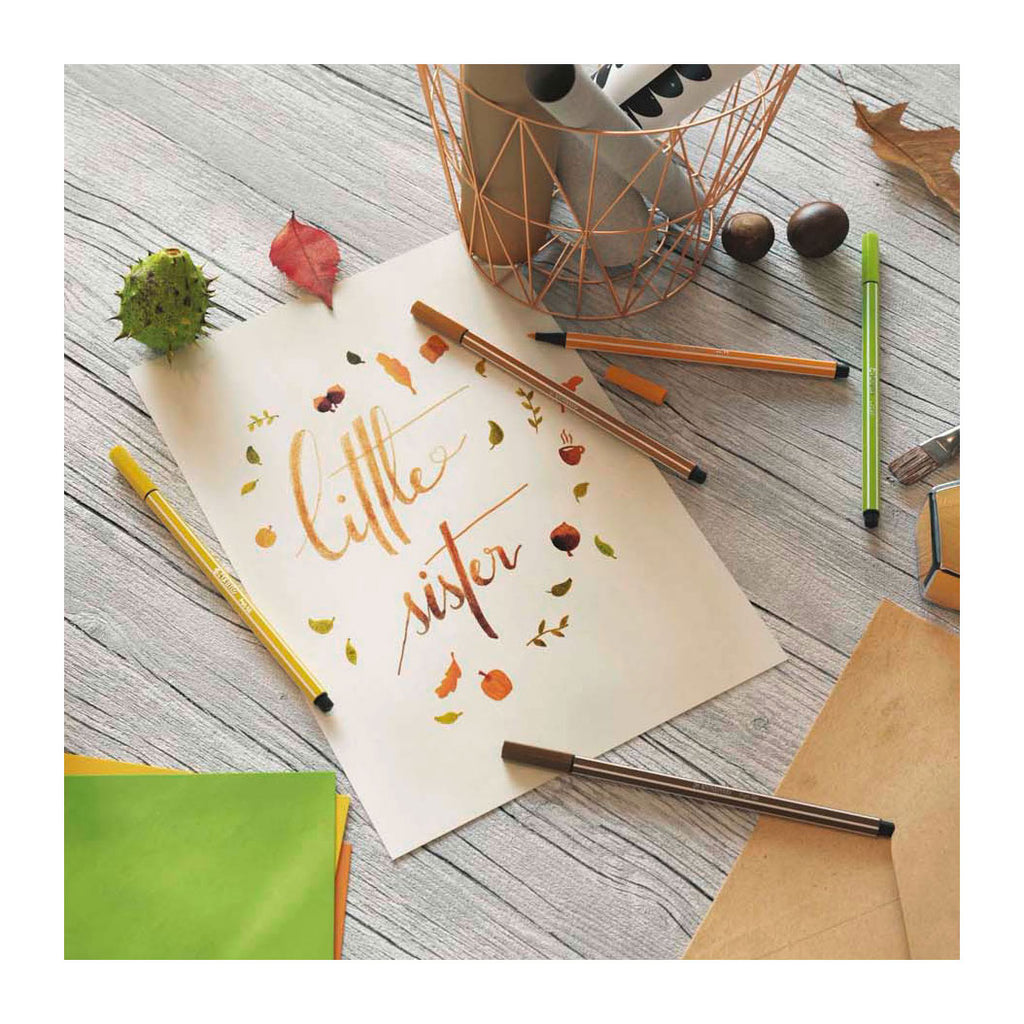 De beste viltstift die je kunt vinden. De STABILO Pen 68 is een viltstift van topkwaliteit, voor het allerbeste resultaat. Verkrijgbaar in 65 prachtige, heldere kleuren, inclusief 6 fluorescerende kleuren. Of je nu een professional bent of kleurt als hobby, deze top viltstift is perfect voor jou! · Viltstift van zeer hoge kwaliteit · Verkrijgbaar in tientallen kleuren · Robuuste drukbestendige pen punt · Schrijfbreedte ca. 1 mm · Reukloze inkt op waterbasis · Tast toner en watervaste inkt niet aan · Kan tot 24 uur zonder dop zonder uit te drogen · Hoge glans en kleurintensiteit · Alle kleuren los verkrijgbaar · Mengbaar met water voor mooie aquarel effecten en kleuren blenden De STABILO Pen 68 viltstiften zijn viltstiften van de allerhoogste kwaliteit en bieden oneindig veel kleurmogelijkheden. De punt is 1 mm dik voor krachtige lijnen en het inkleuren van vlakken. De robuuste punt zorgt voor een gelijkmatige inktafgifte. De viltstift kan 24 uur zonder dop zonder dat de punt uitdroogt. De kleuren zijn intens en zeer goed dekkend. De inkt is op waterbasis en geurloos. Alle kleuren zijn te mengen met water, waardoor er prachtige aquareleffecten en vloeiende kleur verlopen mee kunnen worden gemaakt. Voor het mooiste aquarel resultaat breng je de gewenste kleur aan op een stukje folie of een schoteltje en vervolgens pak je de kleur op met een nat kwastje. Bij gebruik met water is het aan te raden om dikker papier of karton te gebruiken. Alle kleuren kunnen met elkaar gemengd worden, zodat elke gewenste kleur kan worden gemaakt. Door gelijkmatig met een vochtig wattenstaafje over de grote vlakken te wrijven ontstaan mooie, regelmatige kleurovergangen. De kwaliteit van het papier bepaalt ook de kwaliteit van het mengen met water. Niet geschikt voor kinderen onder 3 jaar, wegens verstikkingsgevaar door kleine onderdelen.