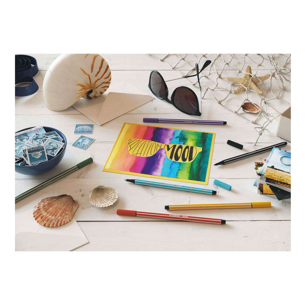 De beste viltstift die je kunt vinden. De STABILO Pen 68 is een viltstift van topkwaliteit, voor het allerbeste resultaat. Verkrijgbaar in 65 prachtige, heldere kleuren, inclusief 6 fluorescerende kleuren. Of je nu een professional bent of kleurt als hobby, deze top viltstift is perfect voor jou! · Viltstift van zeer hoge kwaliteit · Verkrijgbaar in tientallen kleuren · Robuuste drukbestendige pen punt · Schrijfbreedte ca. 1 mm · Reukloze inkt op waterbasis · Tast toner en watervaste inkt niet aan · Kan tot 24 uur zonder dop zonder uit te drogen · Hoge glans en kleurintensiteit · Alle kleuren los verkrijgbaar · Mengbaar met water voor mooie aquarel effecten en kleuren blenden De STABILO Pen 68 viltstiften zijn viltstiften van de allerhoogste kwaliteit en bieden oneindig veel kleurmogelijkheden. De punt is 1 mm dik voor krachtige lijnen en het inkleuren van vlakken. De robuuste punt zorgt voor een gelijkmatige inktafgifte. De viltstift kan 24 uur zonder dop zonder dat de punt uitdroogt. De kleuren zijn intens en zeer goed dekkend. De inkt is op waterbasis en geurloos. Alle kleuren zijn te mengen met water, waardoor er prachtige aquareleffecten en vloeiende kleur verlopen mee kunnen worden gemaakt. Voor het mooiste aquarel resultaat breng je de gewenste kleur aan op een stukje folie of een schoteltje en vervolgens pak je de kleur op met een nat kwastje. Bij gebruik met water is het aan te raden om dikker papier of karton te gebruiken. Alle kleuren kunnen met elkaar gemengd worden, zodat elke gewenste kleur kan worden gemaakt. Door gelijkmatig met een vochtig wattenstaafje over de grote vlakken te wrijven ontstaan mooie, regelmatige kleurovergangen. De kwaliteit van het papier bepaalt ook de kwaliteit van het mengen met water. Niet geschikt voor kinderen onder 3 jaar, wegens verstikkingsgevaar door kleine onderdelen.