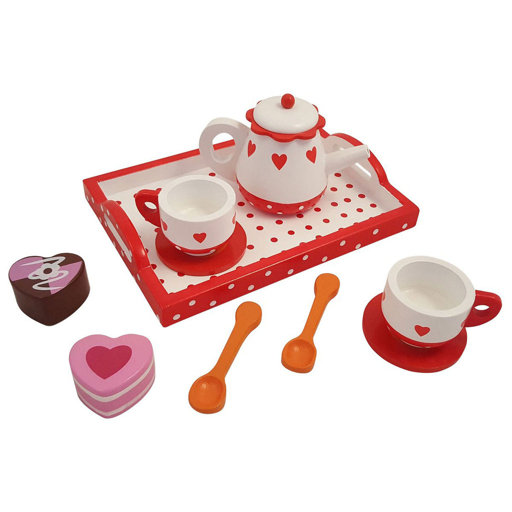 Geniet van gezellige theekransjes met dit prachtige theeservies. Het theeservies heeft een schattig design met hartjes en stippen op de kopjes, de theepot en het dienblad. Het wordt geleverd met 2 lepels, 2 schotels en 2 gebakjes, waardoor de kinderen nog meer plezier kunnen hebben tijdens het spelen. Het theeservies is gemaakt van stevig hout en is een geweldige aanvulling op het speelkeukentje. Laat de kinderen hun fantasie de vrije loop laten met dit geweldige speelgoed.