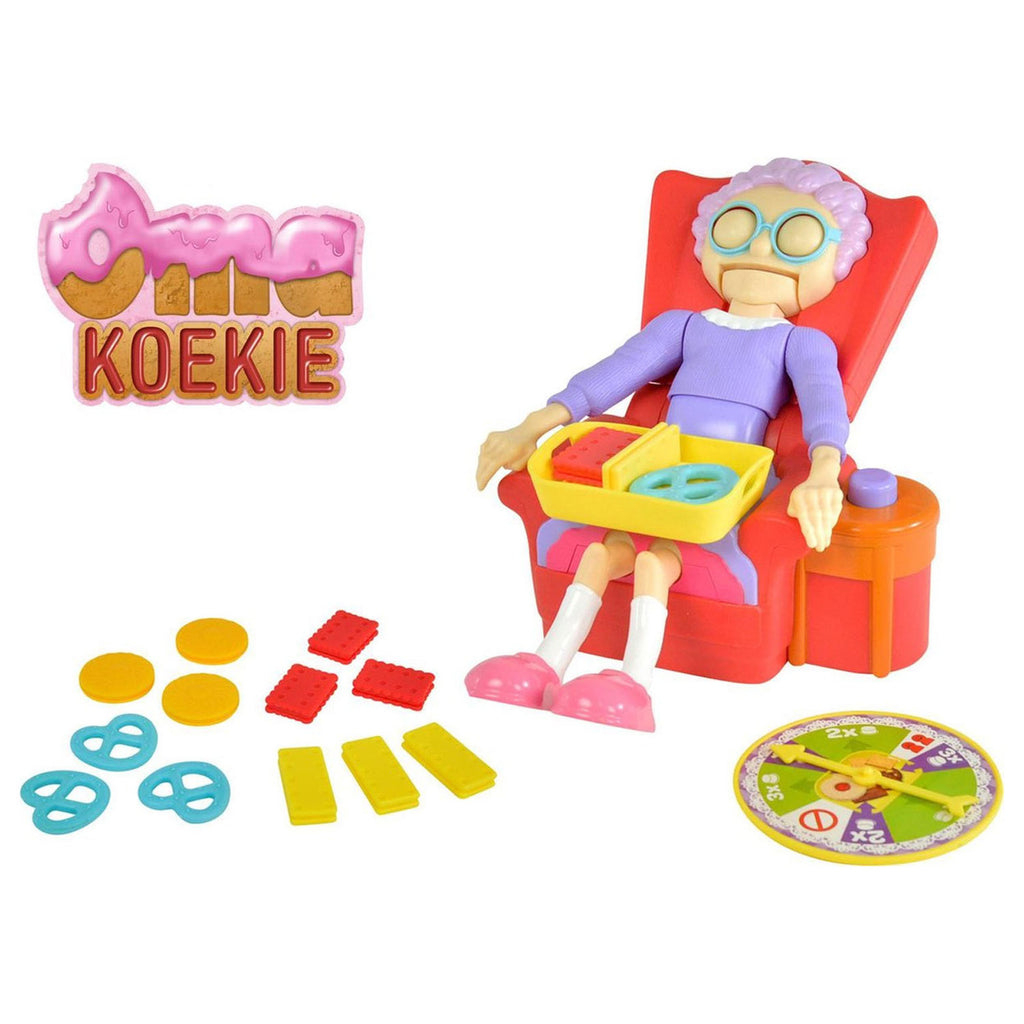 Durf jij het koekje te pakken, zonder Oma wakker te maken?! Oma is dol op koekjes en wil ze het liefst met niemand delen. Dus als oma in slaap valt, houdt ze de schaal met koekjes stevig vast op haar schoot - wat een hebzuchtige oma! Dit is jouw kans om de koekjes van oma's schaal te pakken. Draai om de beurt aan de draaischijf en pak zo voorzichtig en stil mogelijk van elk type een koekje van de schaal van oma. Daarna moet je op de knop drukken, zoveel keer als staat aangegeven op de draaischijf. Maar pas op, want één verkeerde beweging zal haar wakker maken en haar tanden laten vliegen! Al je koekjes moeten dan onmiddellijk terug op de schaal! Wie het eerste van ieder type een koekje heeft verzameld, is de winnaar! Oma Koekie is een ondeugend spel van TOMY. Perfect voor het hele gezin. Oma Koekie zit vol spanning en zorgt steeds weer voor veel plezier!