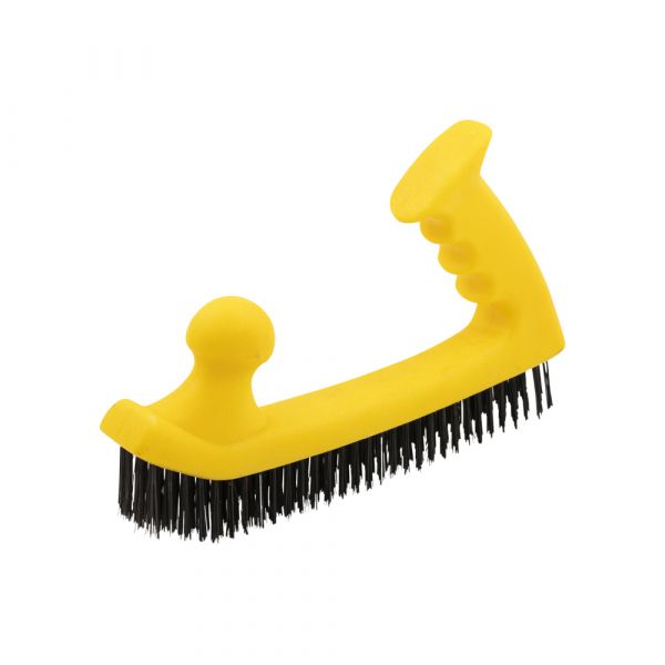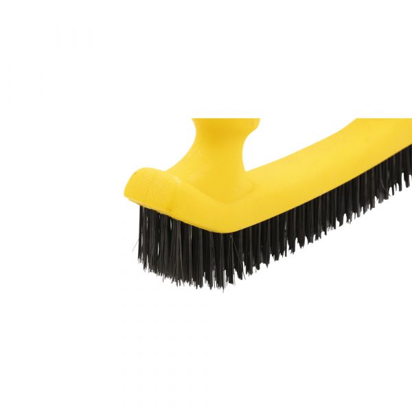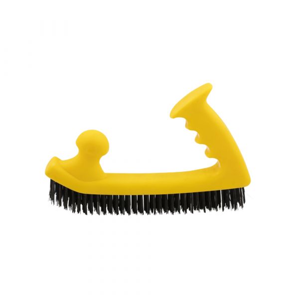 Staalborstel met handgreep assorti kleuren Stevige volkunststof staalborstel met vijf rijen draad en goede ergonomische gevormde grepen voor langdurig gebruik. Lengte circa 245 mm. Professionele kwaliteit. Wordt assorti geleverd in de kleuren geel en oranje.