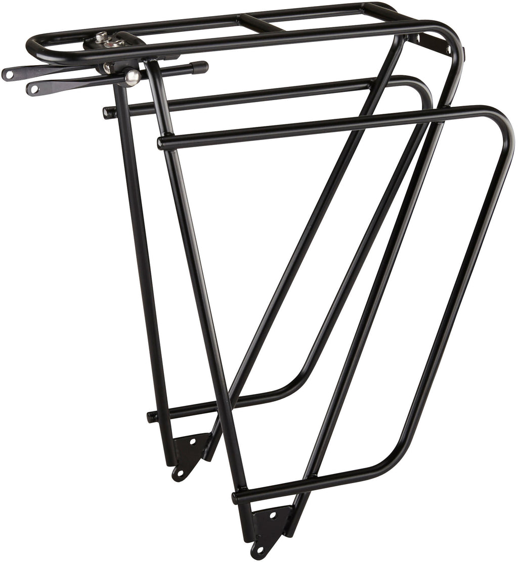 25CrMo4, met tas-stoppers, V-poot, achtervorkbevestiging, zwart Afzonderlijke ogen voor spatbord-stangen, door laag geplaatste tasbeugels wordt de zwaartepunt van de bagage beter verdeeld, niet geschikt voor kinderzitjes, max. draaglast 26 kg, gewicht incl. aanbouwdelen ca. 800 g Bevestiging liggende achtervork Eigenschappen tassen-steun Geschikte wielmaten 26 " , 27,5 " , 28 " Hoofdkleur zwart Max. draaglast 26 kg Montage achterop Type/soort Artikel
