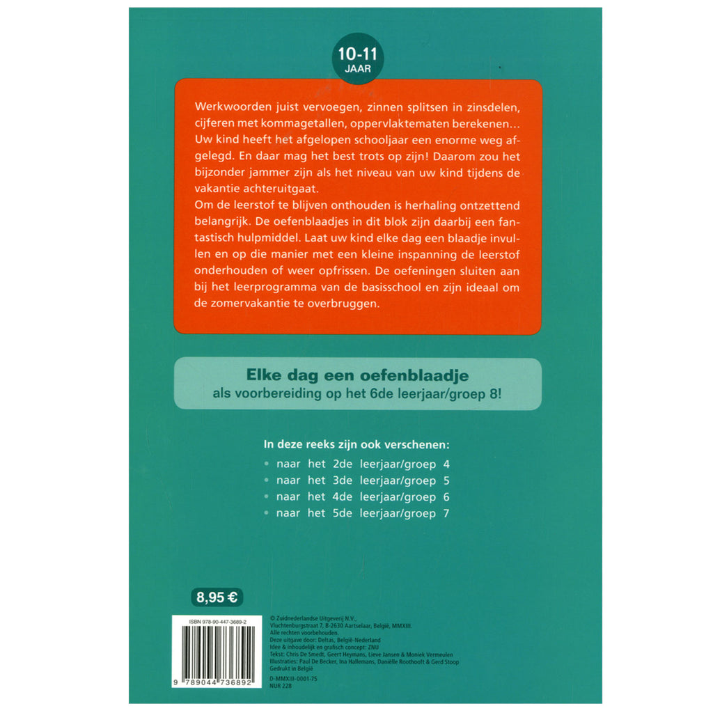 Herhalingsoefeningen taal en rekenen Werkwoorden juist vervoegen, zinnen splitsen in zinsdelen, cijferen met kommagetallen, oppervlaktematen berekenen... Uw kind heeft het afgelopen schooljaar een enorme weg afgelegd. En daar mag het best trots op zijn! Daarom zou het bijzonder jammer zijn als het niveau van uw kind tijdens de vakantie achteruitgaat. Om de leerstof te blijven onthouden is herhaling ontzettend belangrijk. De oefenblaadjes in dit blok zijn daarbij een fantastisch hulpmiddel. Laat uw kind elke dag een blaadje invullen en op die manier met een kleine inspanning de leerstof onderhouden of weer opfrissen. De oefeningen sluiten aan bij het leerprogramma van de basisschool en zijn ideaal om de zomervakantie te overbruggen
