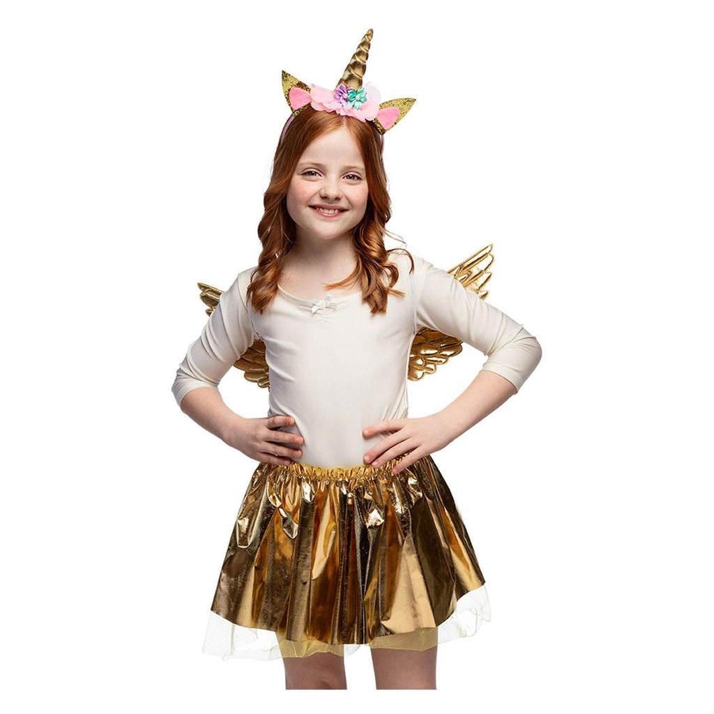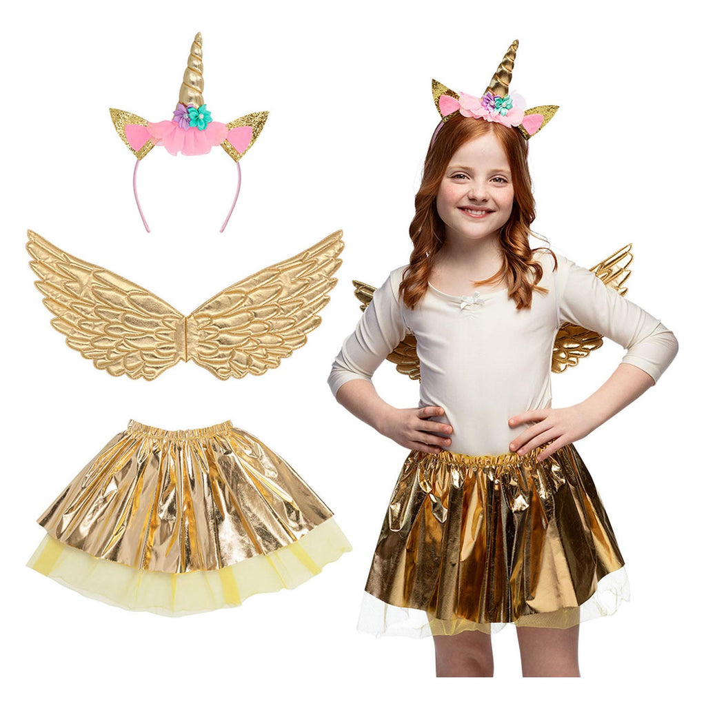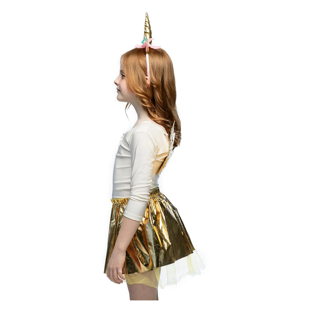 Gouden eenhoornfee verkleedset voor kinderen. Deze betoverende set is perfect voor kleine meisjes die dol zijn op eenhoorns en feeën. De set bestaat uit een schattig rokje (tutu) met glinsterende gouden details, een haarband met een magische eenhoornhoorn en prachtige gouden vleugels. Met deze set kan je kind zich transformeren in een betoverende eenhoornfee en haar fantasie de vrije loop laten.