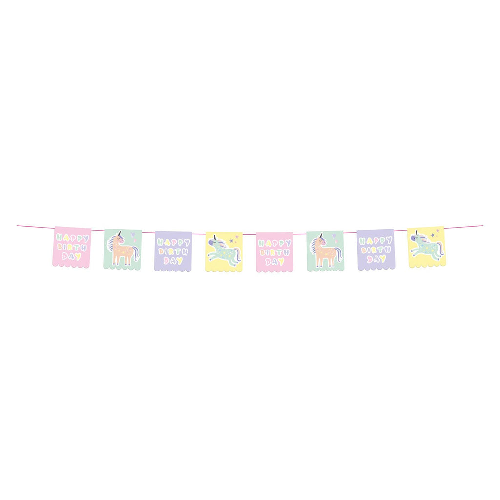 Deze leuke vlaggenlijn is perfect voor de verjaardag van jouw kleine eenhoornfan! Met mooie eenhoornafbeeldingen en zachte pastelkleuren, past deze slinger helemaal in het unicornthema. De vlaggenlijn is maar liefst 6 meter lang en heeft 12 vlaggetjes van 18x21 cm. Gemaakt van papier en dubbelzijdig bedrukt, is dit een feestelijke toevoeging aan elke eenhoornverjaardag!