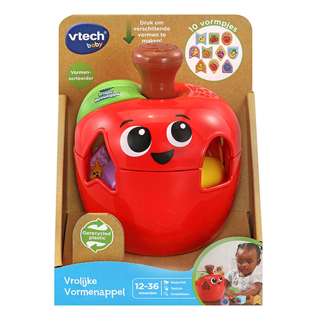 De Vrolijke Vormenappel is een innovatieve twist op de klassieke vormensorteerder. Met een druk op de appel kunnen er 10 bekende en nieuwe vormen worden gemaakt waar de bijbehorende vormpjes in passen. Deze leuke appel helpt het kleintje nieuwe vormen en fruitsoorten te ontdekken, terwijl het tegelijkertijd de fijne motoriek en tastzin ontwikkelt. Het is tijd om te spelen, dus druk en draai!