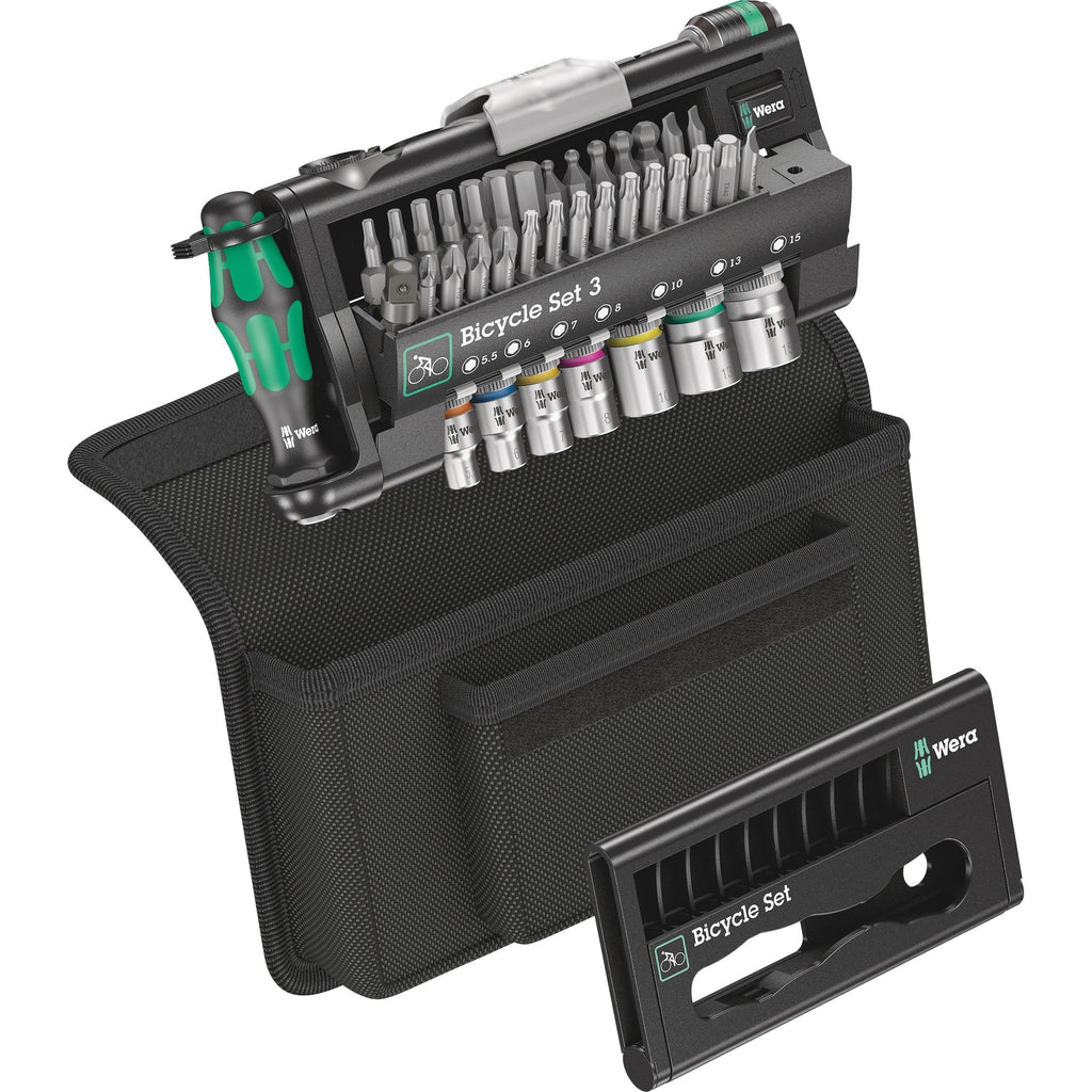 De Wera Bicycle Set 3 is een set met gereedschap speciaal voor de fiets. De set is een variant op de Tool Check Plus-set van Wera met aanpassingen voor deze fietsuitvoering, zoals een 15 mm dop, kogelkop inbusset en drie verschillende zaagsnede bits. Daarnaast zit de set in een luxe etui en zit er een lege houder bij om je favoriete miniratelsetje mee samen te stellen. De set bestaat uit 28 bits en zeven doppen, een handhouder 813 passend voor de opname van bits met een 1/4"-buitenzeskant-aandrijving conform DIN ISO 1173-C 6,3 en de Wera aansluitende serie.