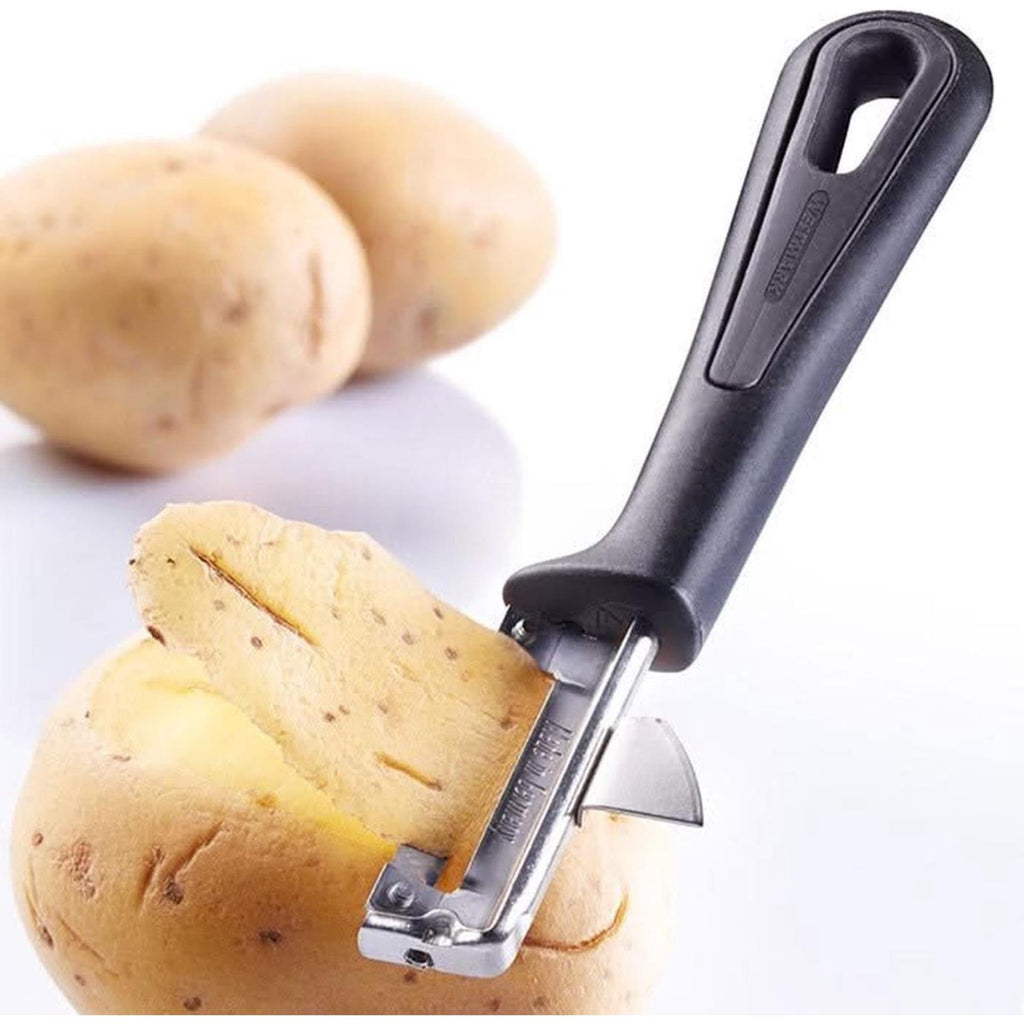 Westmark Swivel dunschillervoor ronde of langwerpige groenten en fruit zoals aardappelen, komkommers, asperges en appels. Dedunschiller heeft eenvlijmscherpe uitsteker, ook heeft hijeen mesbeschermer. Zuinig schillen dankzij bewegend mes dat zich automatisch aan de vorm van het voedsel aanpast. Kleur: zwart.