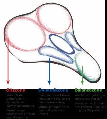 - Voorste balanszone: zacht, voorgevormde gekoppelde uitloop. Voordeel: nauwer contact met fiets, stabilisering van de fietspositie.