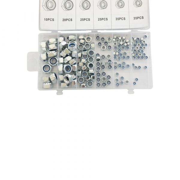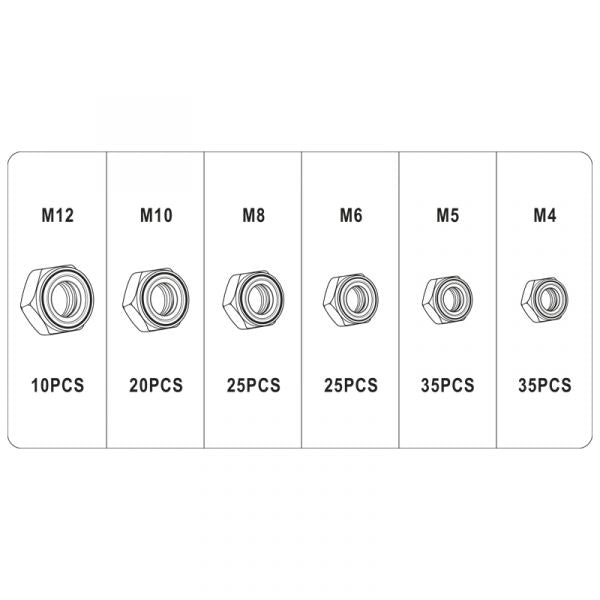 Assortiment de contre-écrous 150 pièces Composé de : 10 x M12 autobloquant 20 x M10 autobloquant 25 x M 8 autobloquant 25 x M 6 autobloquant 35 x M 5 autobloquant 35 x M 4 autobloquant Emballé dans une boîte en plastique.