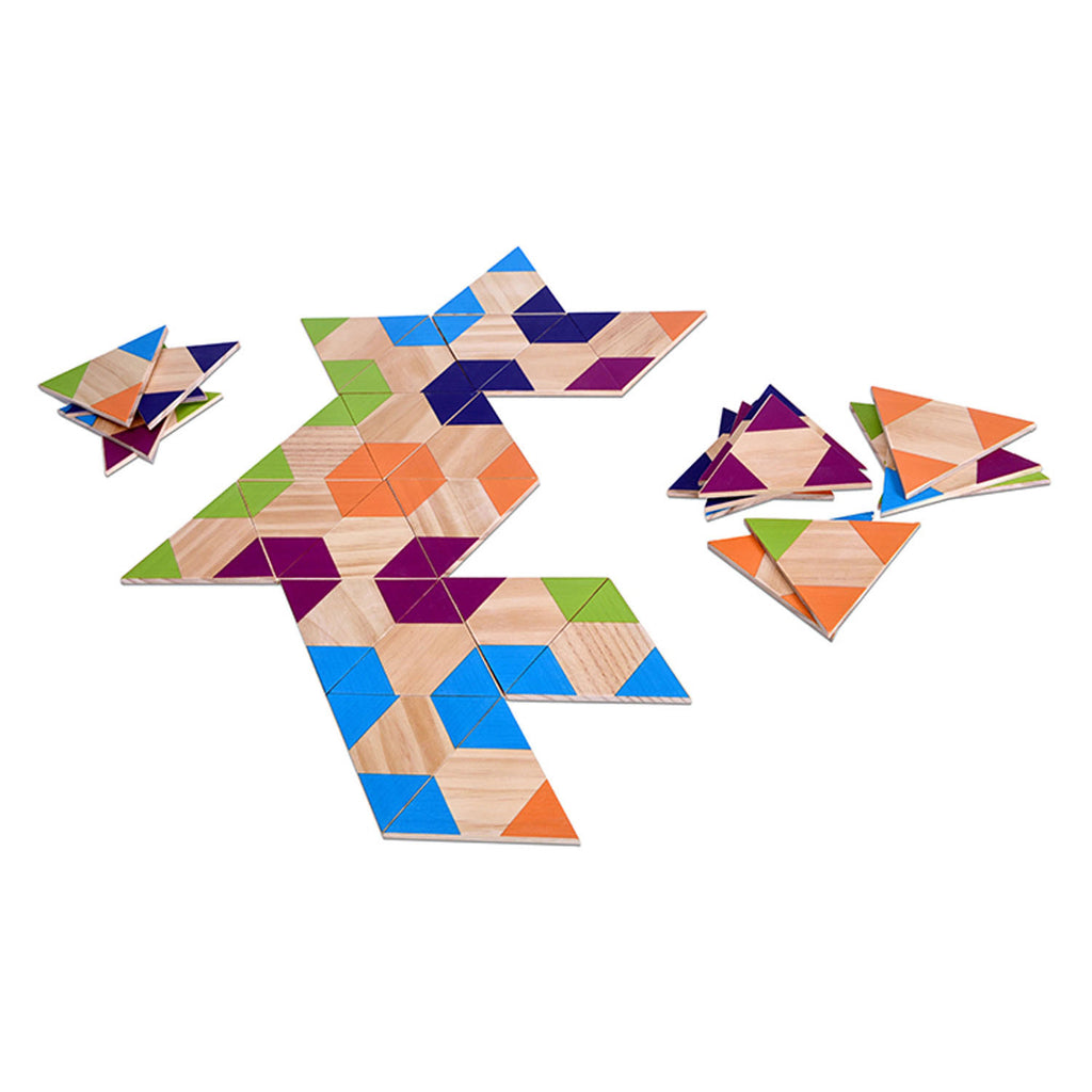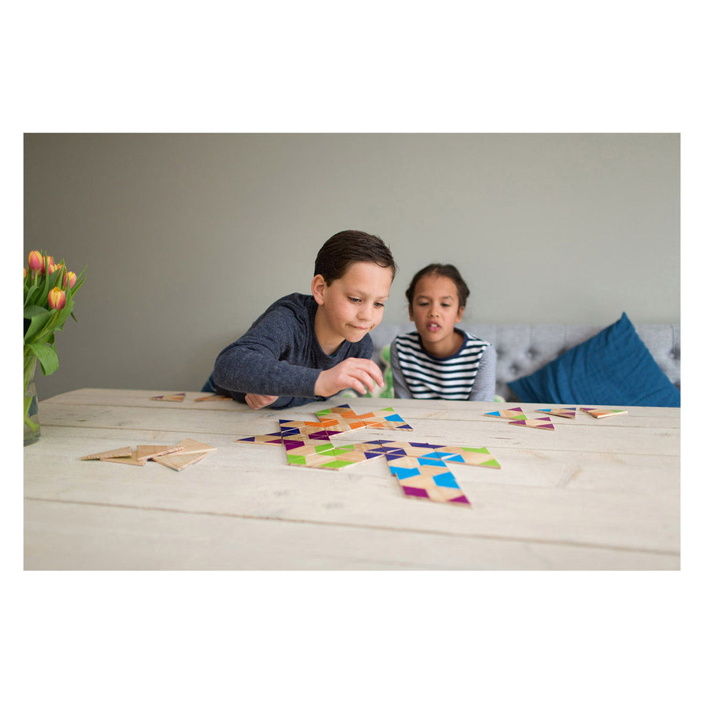 Bij dit spel moet je proberen de driehoeken met de goede kleuren aan elkaar te leggen. Dit levert mooie figuren op! Lukt het jou om als eerste al je stenen kwijt te raken? Dit spel ruime ruimtelijk inzicht en begrip en is door het gebruik van kleuren geschikt voor zowel jong als oud.