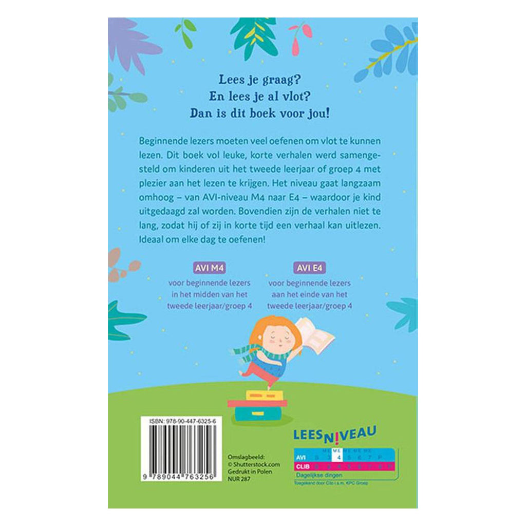 Dit boek vol leuke, korte verhalen op AVI-niveau M4 en E4 is speciaal samengesteld voor kinderen uit het tweede leerjaar van groep 4. Als beginnende lezers moeten ze veel oefenen om vlot te kunnen lezen en dat kan met deze bundel! Het niveau gaat langzaam omhoog en de verhalen zijn niet te lang, zodat kinderen ze in korte tijd kunnen uitlezen. AVI M4 voor beginnende lezers in het midden van het tweede leerjaar/groep 4 AVI E4 voor beginnende lezers aan het einde van het tweede leerjaar/groep 4