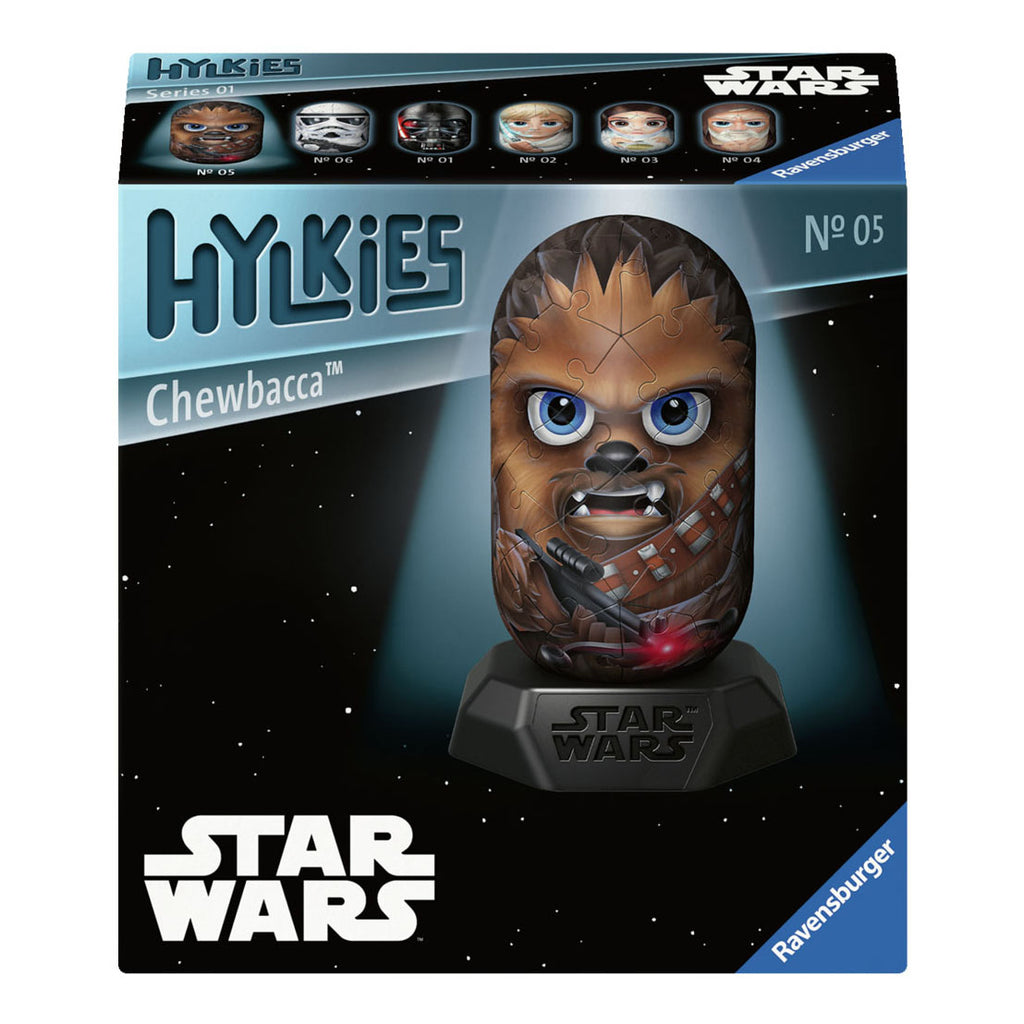 Iedereen die van Star Wars houdt, zal gek zijn op de Hylkies. Je favoriete personages uit Star Wars, uniek geïllustreerd in een iconische capsulevorm die je zelf in elkaar kunt zetten. De figuren zijn snel en eenvoudig in elkaar te zetten dankzij de genummerde onderdelen en zijn geweldige verzamelobjecten: suggestief of als een hele serie Hylkies, waarin de verschillende figuren perfect naast elkaar staan. Een must-have voor echte fans! De Star Wars Chewbacca - Om verliefd op te worden! De Hylkies beelden een aantal van de beroemdste filmhelden uit: uniek geïllustreerd op een bijzondere 3D capsulevorm. Ontdek je favoriete stukje bij beetje opnieuw: met 54 vaste plastic puzzelstukjes, aan de achterkant genummerd, kun je één van je favoriete helden maken. Eenmaal in elkaar, kun je hem op de voet plaatsen en dan als blikvanger ergens neerzetten. Of het nu gaat om één figuur van een verzameling van meerdere Hylkies door de speciaal ontworpen capsule-look zijn ze een onmogelijke van elke verzameling. Naast de basis en de hoogwaardige kunststof onderdelen die worden gebruikt om de capsule in elkaar te zetten, wordt elk figuur ook geleverd met een kleine personagekaart.