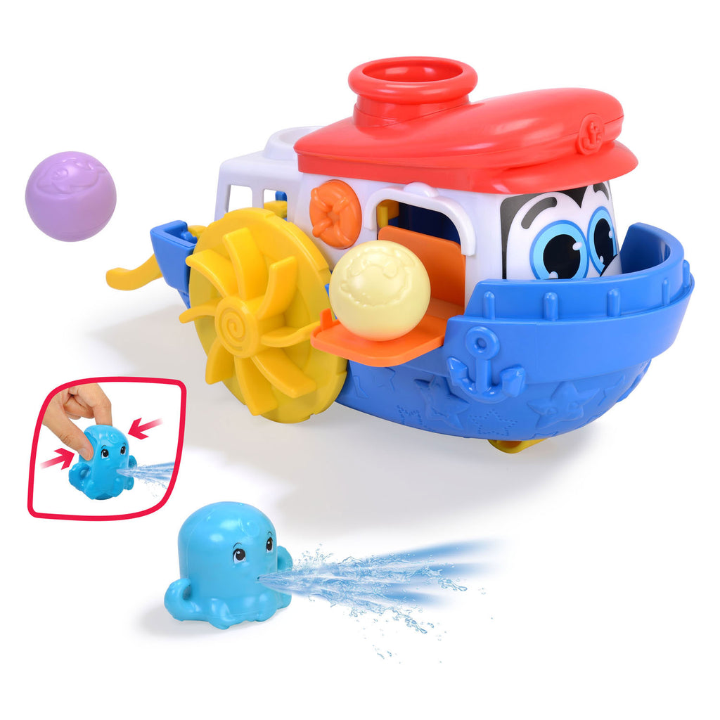 ABC Sammy Splash - het ultieme badspeeltje! Dankzij het ontwerp boordevol functies kun je van slechte tijd een leuke en leerzame ervaring maken. Naast dat hij in het water drijft, beschikt hij ook over roterende wielen, zodat hij ook buiten de badkuip gebruikt kan worden, en een oprit die klikgeluiden maakt om de aandacht van je soort te trekken en de zintuigen te stimuleren. De boot wordt ook geleverd met een octopusfiguur die water kan spuiten, daarnaast twee praktische ballen die in de schoorsteen kunnen worden gegooid en via de praktisch helling kunnen worden uitgenomen - ideaal voor het trainen van de fijne motoriek. Naast een kleurrijke en schattige design heeft de ABC Sammy Splash ook afgeronde randen om de kans op blessures te voorkomen. Bij Dickie Toys maken we kwaliteitsspeelgoed waarin je kunt vertrouwen. Als internationaal duurzaam en gecertificeerde speelgoedfabrikant zijn kwaliteit en veiligheid onze topprioriteiten. Kenmerken • Speelgoedboot met roterende wielen • Drijvend ontwerp • Knijpbare octopus met watersproeifunctie • 2 ballen met dierenmotief (dolfijn en kogelvis) • Lengte: 30 cm