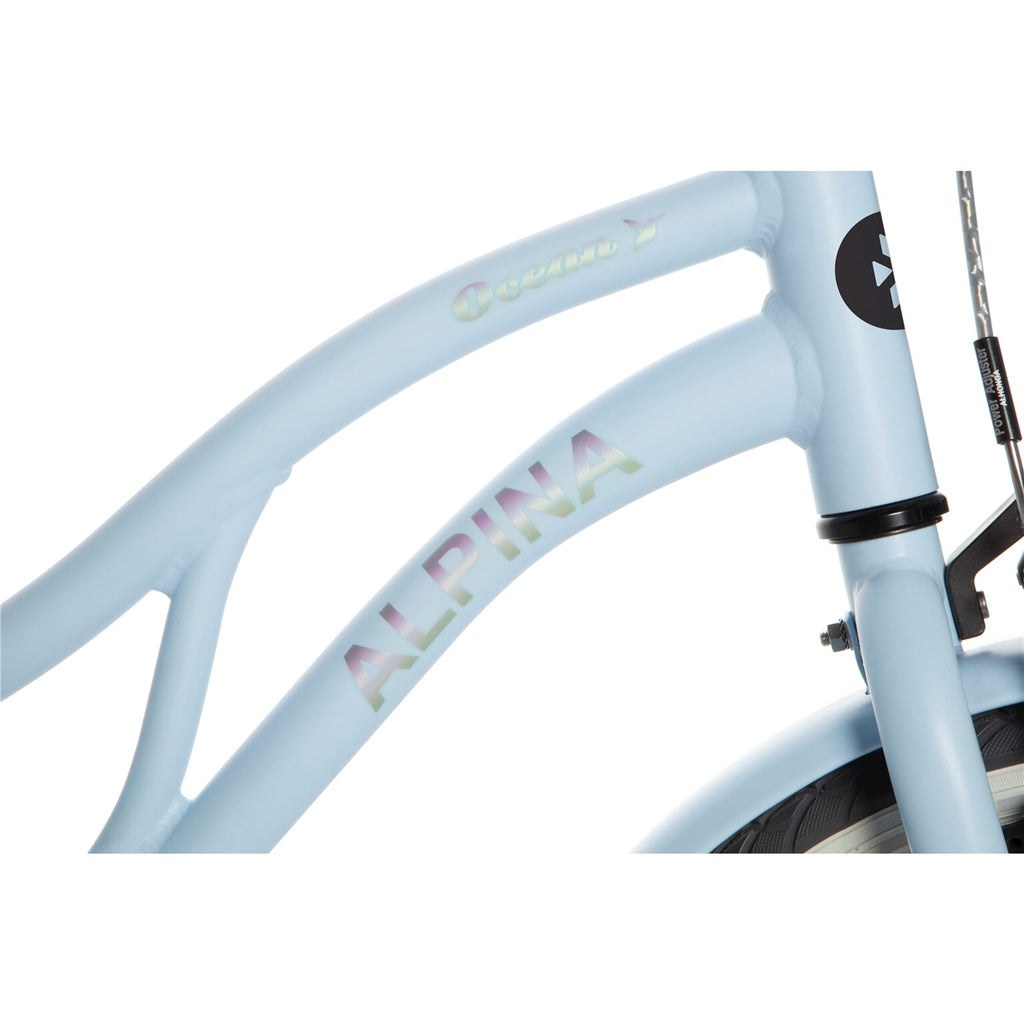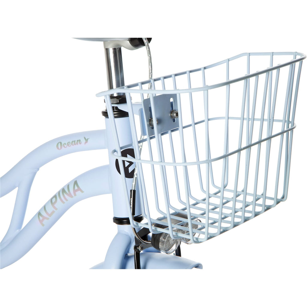 Alpina fiets Ocean Meisjes, 20inch. Kleur: IJsblauw Mat. Uitgerust met achter een remnaaf en een V-brake voor, inclusief mandje, aluminium frame. Kleurnummer: PMS 291 C Matt.