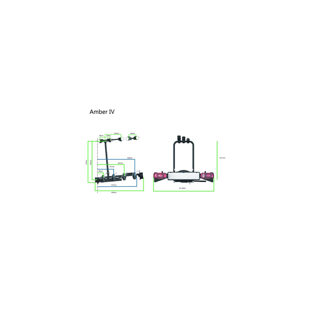 Amber IV Deze lichtgewicht fietsendrager is ontwikkeld voor het transport van 4 fietsen. De Amber IV is eenvoudig op de trekhaak te plaatsen door de gepatenteerde snelkoppeling. Op deze fietsendrager worden fietsen stevig bevestigd in brede, stabiele kunststof wielhouders. Er is geen belasting op het crankstel van de fietsdeurframebevestiging. De verlichting werkt via een gecombineerde 7/13-polige (Jaeger) stekker, incl. mistachterlicht en achteruitrijverlichting (via 13-polige stekker). De kofferbak blijft toegankelijk door het eenvoudig te bedienen kantelmechanisme en de fietsendrager is afsluitbaar met een hangslot. De Amber IV van Pro-User is een lichtgewicht fietsendrager voor de transportwagen van 4 fietsen. Deze fietsendrager is eenvoudig op de trekhaak te plaatsen door de gepatenteerde snelkoppeling. Op de Amber II worden fietsen stevig bevestigd in brede, stabiele kunststof wielhouders en er is geen belasting op het crankstel van de fiets door middel van framebevestiging. Amber IV De verlichting werkt via een gecombineerde 7/13-polige (Jaeger) stekker, incl. mistachterlicht en achteruitrijverlichting (via 13-polige stekker). De kofferbak blijft toegankelijk door het eenvoudig te bedienen kantelmechanisme en de fietsendrager is afsluitbaar met een hangslot (exclusief). Algemene specificaties: Kleur: zwart Materiaal: gecoat staal Geschikt voor e-bikes: nee Geschikt voor caravan: ja, icm hulpstuk Aantal fietsen: 4 Specificaties functies: Contactdoos voor trekhaak: 7-polig, 13-polig Fietshouderuitvoering: op de trekhaakkoppeling Handleiding: ingevuld, zie ook onder downloads Bevestiging van fietsframe: dmv frame methouders spanband Bevestigingshouders: verstelbaar Kantelbaar: ja Inklapbaar: nee Specificaties capaciteit: Afmetingen: 100 x 71 x 83 cm (L x B x H) Diameter fietsframe: universeel Wielbasis fiets (max.): 120 cm Fietsband breedte (max.): 6 cm Wielgoot afstand: 18 cm Laadvermogen (max.): 60 kg Gewicht: ca. 50 kg 19,5 kg