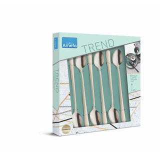 . Een bestekset van 6 lattelepels. Geschikt voor in de vaatwasmachine, maar gebruik een reinigingsmiddel met een fosfaatgehalte van 3% pils en een afwasprogramma van 40ºC pils. Voorkeur om met de hand te wassen voor het behoud van de kleur en glans.