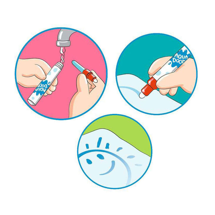 Onbekommerd tekenen met Aqua Doodle Little Artist zonder kans op geklieder en vlekken. Fantastisch! De stift vult met leidingwater. Het water maakt blauwe lijnen op de tekenmat en ze verdwijnen als het water opdroogt. Het oefent de fijne motoriek en de concentratie en creativiteit. Voor kinderen vanaf 24 jaar.