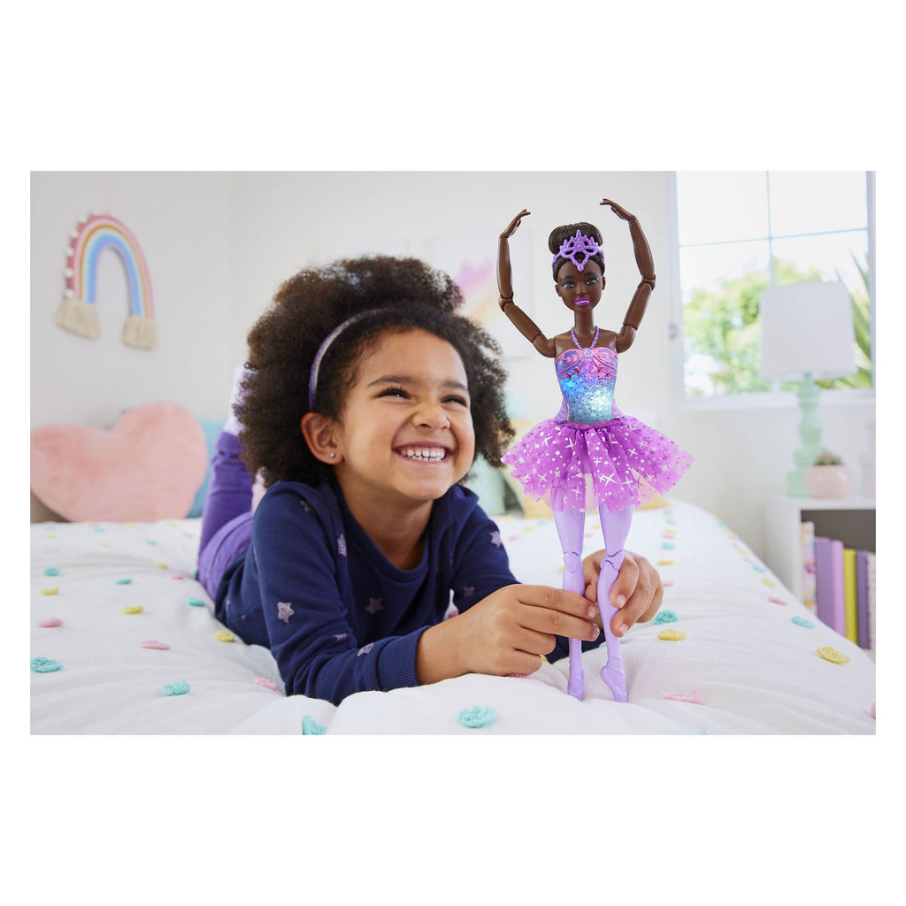 Kijk hoe Barbie licht geeft als ze 'danst'! Deze prachtige ballerina's hebben een magische lichtfunctie die het speelplezier een sprookjesachtig tintje geeft. De beweegbare poppen in prachtige outfits prikkelen de fantasie van kinderen. Ook een geweldig cadeau voor kinderen die van sprookjes houden! Per stuk verkrijgbaar, afhankelijk van beschikbaarheid. Barbiepoppen kunnen niet los staan. Kleuren en versieringen kunnen verschillen.