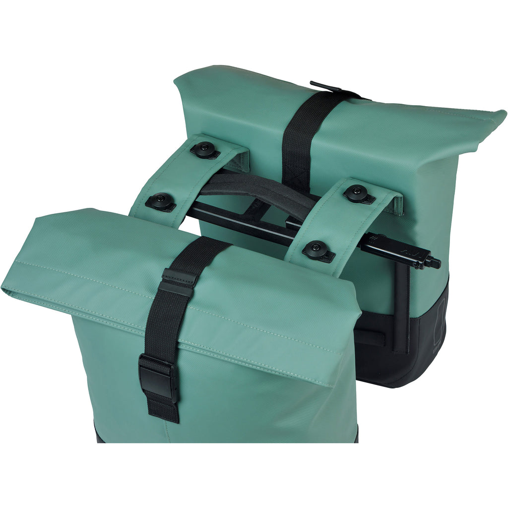 Tijdloze stijl voor dagelijks gebruik De Basil Cove dubbele fietstas is ontworpen voor wie elke dag onderweg is en zoekt naar een betrouwbare stijlvolle fietstas. Van boodschappen doen en woon-werkverkeer tot een dagje uit met het gezin. Deze dubbele tas beweegt moeiteloos met je dag mee. De ingetogen kleurencombinatie silvergreen/black geeft je fiets een frisse rustige uitstraling die perfect past bij een actieve levensstijl. Design & stijl Met zijn cleane lijnen, tweekleurig ontwerp en uniseks uitstraling sluit de Basil Cove perfect aan bij het actieve stedelijke leven. De tas oogt strak zonder overdaad en straalt tegelijkertijd degelijkheid en stijl uit. Een echte allrounder voor iedereen die houdt van een functionele én fraaie tas. Gebruiksgemak & functionaliteit De tas biedt een inhoud van 28 tot 32 liter verdeeld over twee ruime hoofdvakken. Dankzij de waterafstotende vouwsluiting met gesp blijven je spullen goed beschermd. Slim geplaatste klittenbandsluitingen zorgen voor stabiliteit tijdens het fietsen. De tas is ook compatibel met de Basil Distance Holder voor extra veiligheid. Techniek & bevestiging Je bevestigt de Basil Cove dubbele tas MIK eenvoudig dankzij de voorgemonteerde MIK-adapterplaat die voorzien is van een handige slotfunctie voor extra veiligheid. Wil je wisselen van fietsaccessoire, voor bijvoorbeeld een fietsmand, dan klik je je dubbele fietstas met gemak weer van de bagagedrager af. Heb je geen MIK bagagedrager op je (elektrische) fiets? Geen probleem! Monteer eenvoudig de MIK Carrierplate op je bagagedrager. Duurzaamheid & materiaalkeuze De Basil Cove is gemaakt van gerecycled PET met vegan leer en is volledig PFAS-vrij. Het materiaal is waterafstotend, sterk en duurzaam. Klaar voor intensief dagelijks gebruik. Kenmerken: Inhoud: 28 32 liter Twee ruime hoofdvakken met vouwsluiting en gesp Klittenbandsluitingen voor extra stabiliteit tijdens het fietsenInclusief voorgemonteerde MIK-adapterplaat Slotfunctie op de adapter voor extra beveiliging Snel wisselen van accessoire dankzij het MIK-systeem Compatibel met MIK Carrierplate voor fietsen zonder MIK-bagagedrager Gemaakt van gerecycled PET met vegan leren details Volledig PFAS-vrij en waterafstotend Duurzaam en geschikt voor dagelijks gebruik Basil Dubbele fietstas, MIK systeemdragers/dragerplaten, incl. voorgemont. MIK Adapterplate 2.0 (70173), 28-32L, gerecycled PET – vegan leather, waterkerende vouwsluiting met gesp, geschikt voor Basil afstandhouder, klittenbandstraps, reflectie Inhoud: 28-32 liter, afmetingen: (L x B x H) 29 x 14,5 x 36 cm, gerecycled PET - veganistisch leer Incl. voorgemonteerde MIK adapterplaat 2.0 (70173), waterdichte vouwsluiting met gesp, compatibel met Basil afstandhouder, klittenbandsluiting, reflectie Breedte 14.5 cm Eigenschappen reflecterend , waterdicht Hoofdkleur zwart Hoogte 36.0 cm Kleurnaam fabrikant schwarz / silbergrün Lengte 29.0 cm Pakvolume 32.00 l Secundaire kleur groen Systeem MIK 2.0 Type/soort Artikel Uitvoering dubbele tas