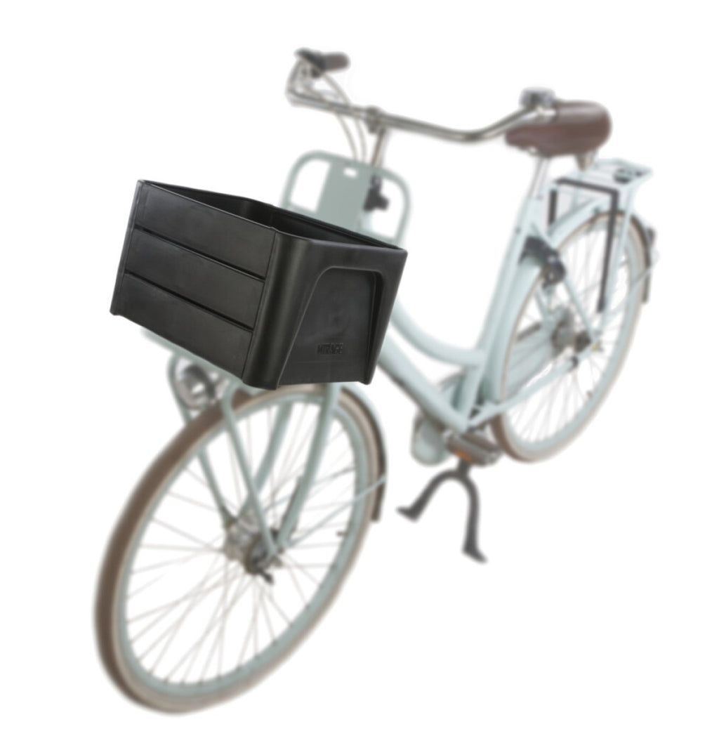 Dagelijks zien we de enorme transporten over de weg, de vaste magazijnen voor opslag en horen we de verhalen over een circulaire economie. Iedereen die fietst helpt mee aan een gezonder lichaam en een gezondere wereld. Dan doe je zo je beste en plaats je een krat op de fiets voor boodschappen van bagage, die precies het enorme transport en opslag (veel lucht) in de hand heeft gewerkt, voordat het bij jou kwam. Daarnaast doen veel kratten, die nu op de markt zijn, niet mee aan een circulaire economie – ze zijn niet van gerecycled materiaal, niet recyclebaar en vooral gemaakt in China. De mensen achter Mirage hebben daar wat op gevonden. Een krat ontworpen en geproduceerd in Nederland, die heel compact is voor transport en opslag, éénmalig door jezelf in elkaar gezet kan worden tot een prachtige blikvanger op je fiets en die gemaakt is van recyclebaar materiaal dat ook weer gerecycled kan worden. Naast het feit dat we zo de wereld een beetje gezelliger proberen te maken, is er ook nog geen wereld aan bagage in. Werelds toch! Afmeting krat 38x29c22CM (LxBxH). Gewichtkrat 1500 gram. Inhoud krat 24 liter. Inhoud doos: 2x zijkant 9x panelen, 3 voorkant - 3 achterkant - 3 bodem 8 tie-wraps voor montage aan drager