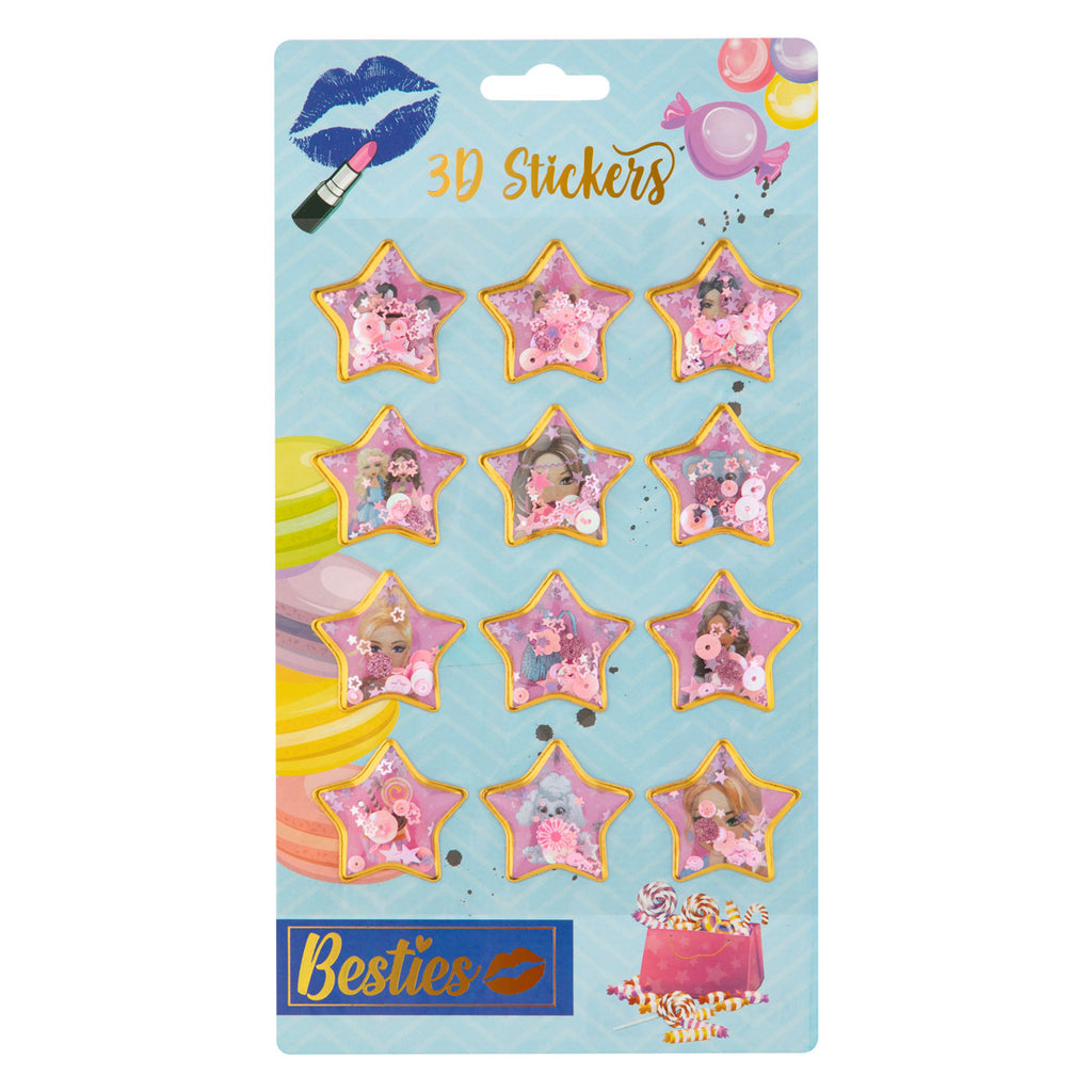 Stickervel met 12 ster- of hartvormige 3D-stickers van Besties. In de stickers 'drijven' kleurrijke pailleten voor een mooi glinstereffect. Niet geschikt voor kinderen jonger dan 3 jaar.