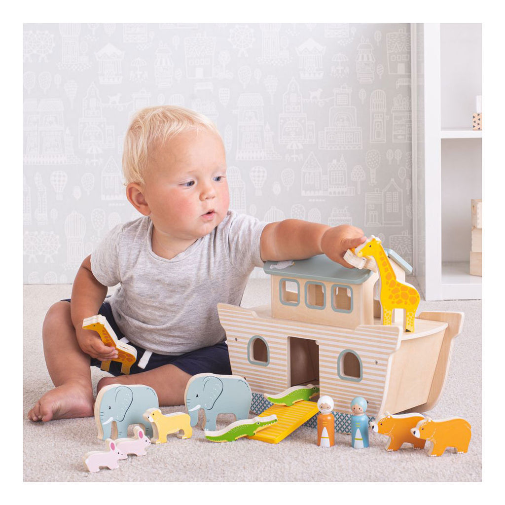 Laat de dieren twee aan twee binnen op onze prachtige FSC® Houten Ark van Noach. De opvouwbare zijhelling maakt het gemakkelijk voor dieren om aan boord te gaan van de boot. Dit houten speelgoed is een fantastische manier om de fantasie van kinderen te ontwikkelen door middel van een creatief rollenspel. Geschilderd in kindvriendelijke verf, zijn de levendige kleuren en texturen aantrekkelijk voor kleine paar ogen.