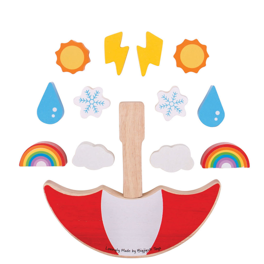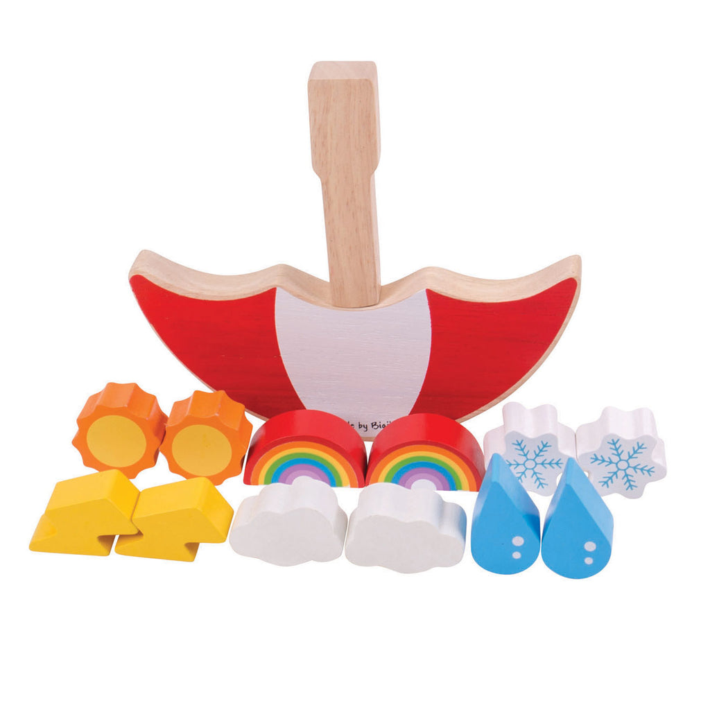 Speel het Houten Balansspel Weer en geniet van een vrolijke en uitdagende activiteit! Plaats de grote rood met wit horizontale paraplu ondersteboven en test je vaardigheden door de zonnestralen, wolkjes, regendruppels, regenboogjes, sneeuwvlokjes en bliksemflitsen er bovenop te plaatsen. Kun jij ze allemaal balanceren zonder dat ze vallen?