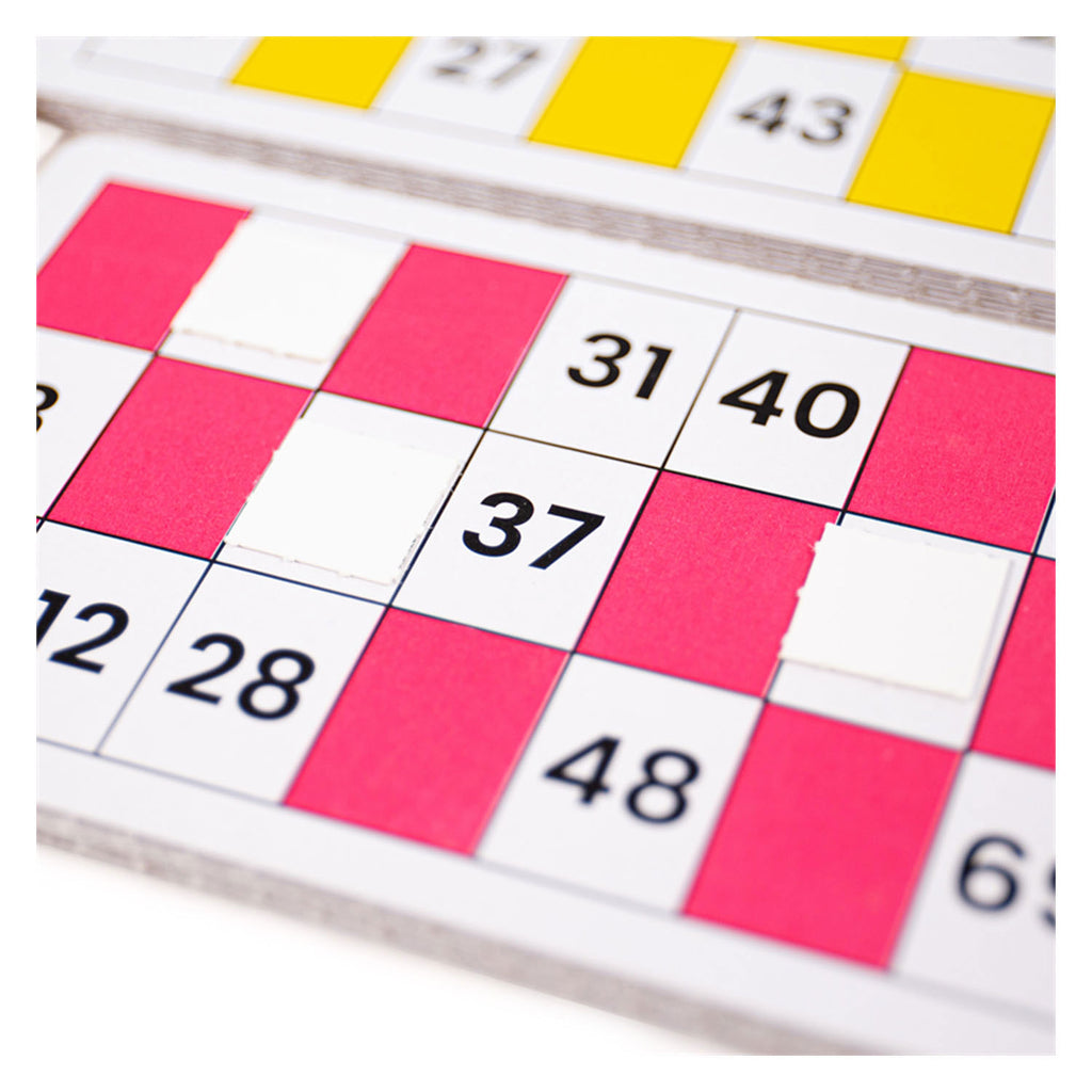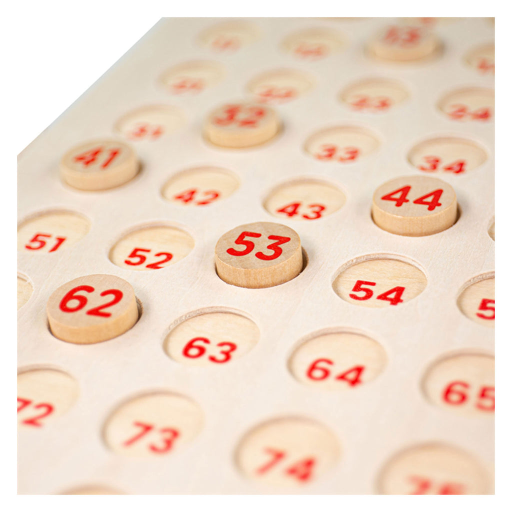 - Inhoud: 105 houten fiches, bingobord en bingokaarten in 4 verschillende kleuren.