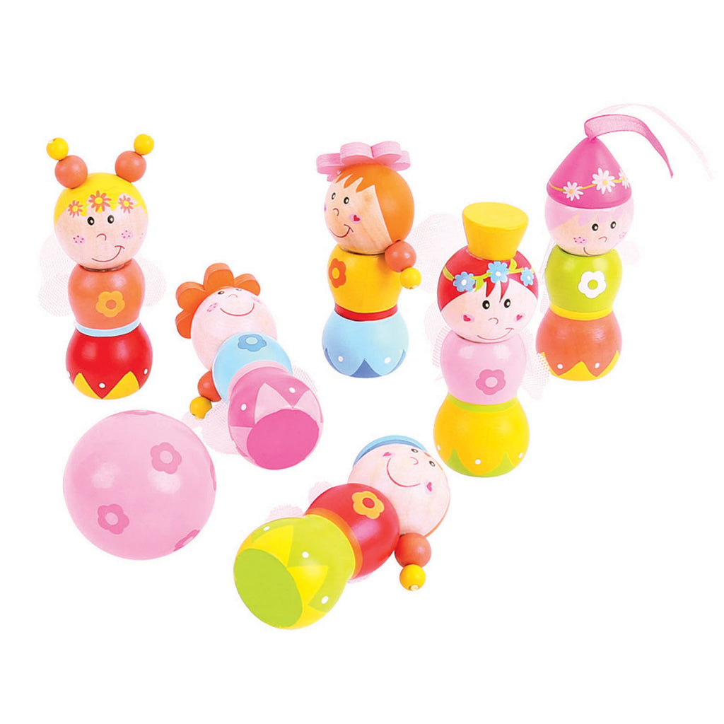 De Houten Bowlingset Prinsessen is een kleurrijke en vrolijke set met 6 prinsesjes. Ben je benieuwd of ze nog steeds lachen als je ze omver knalt? Probeer het uit met de bijgeleverde roze bal!