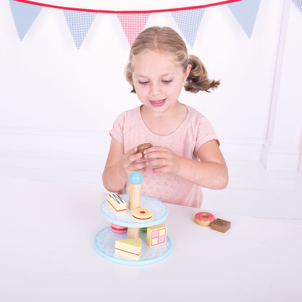 Organiseer je eigen high-tea met deze houten etagère met taartjes van BigJigs.