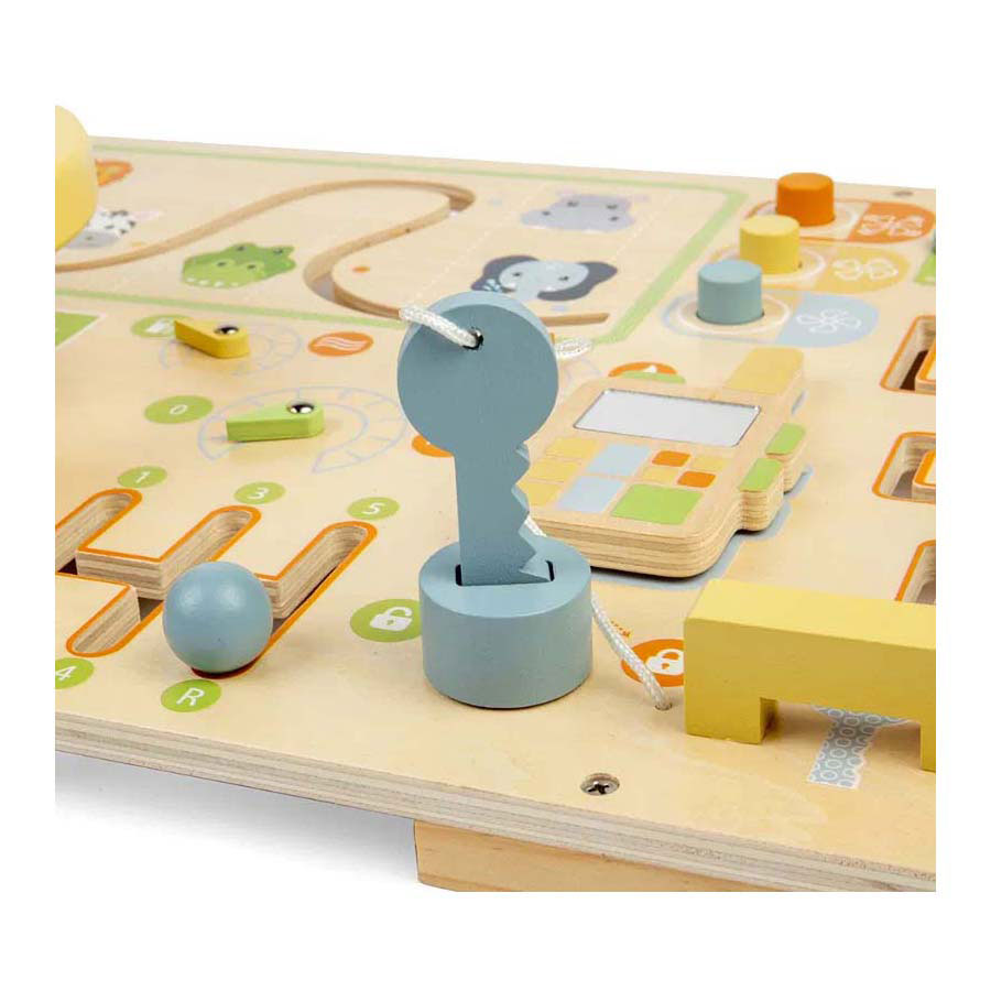 Kleine kinderen worden helemaal enthousiast van ons interactieve Jungle Busy Board! Dit alles-in-éénbord zit vol met activiteiten met jungle-thema om de kleintjes bezig te houden. Kinderen kunnen plezier beleven aan het indrukken van de knoppen, het laten draaien van de wielen en het verplaatsen van de pinnetjes! Het bord helpt mee aan het ontwikkelen van fijne motoriek, hand-oogcoördinatie, probleemoplossende vaardigheden en oorzaak-en-gevolgbegrip ontwikkelen! Kenmerken • 35,7 x 57,6 x 4,5 cm • Gemaakt van FSC®-gecertificeerd hout • Voor 12+ maanden