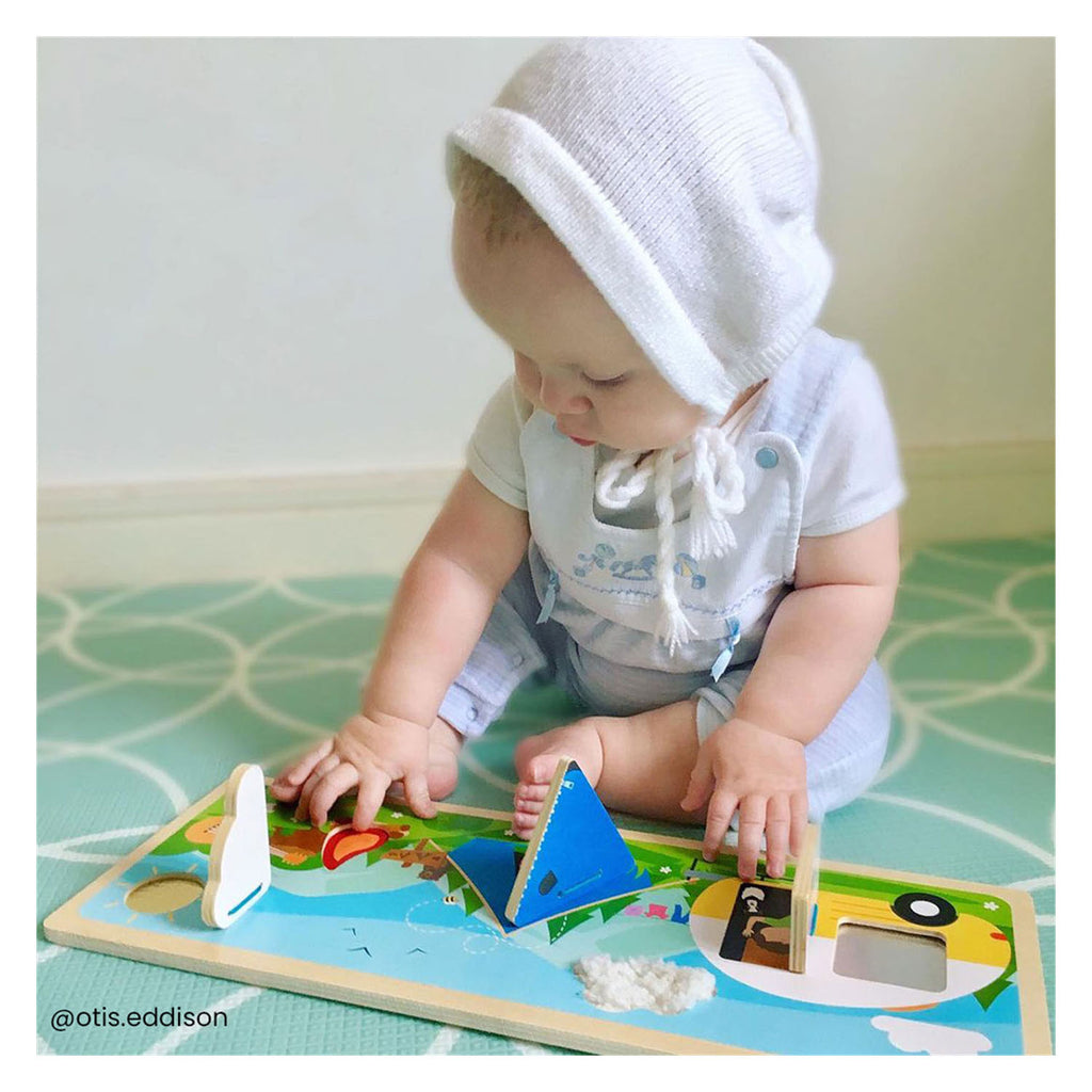 Sensorisch ontdekkingsbord in campingthema. Gemaakt van hoogwaardige, verantwoorde materialen. Voldoet aan de huidige Europese veiligheidsnormen. Geschikt voor 3 jaar en ouder.