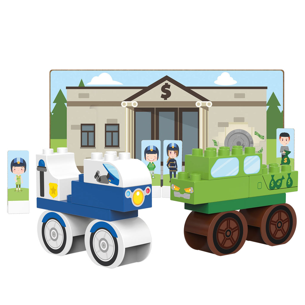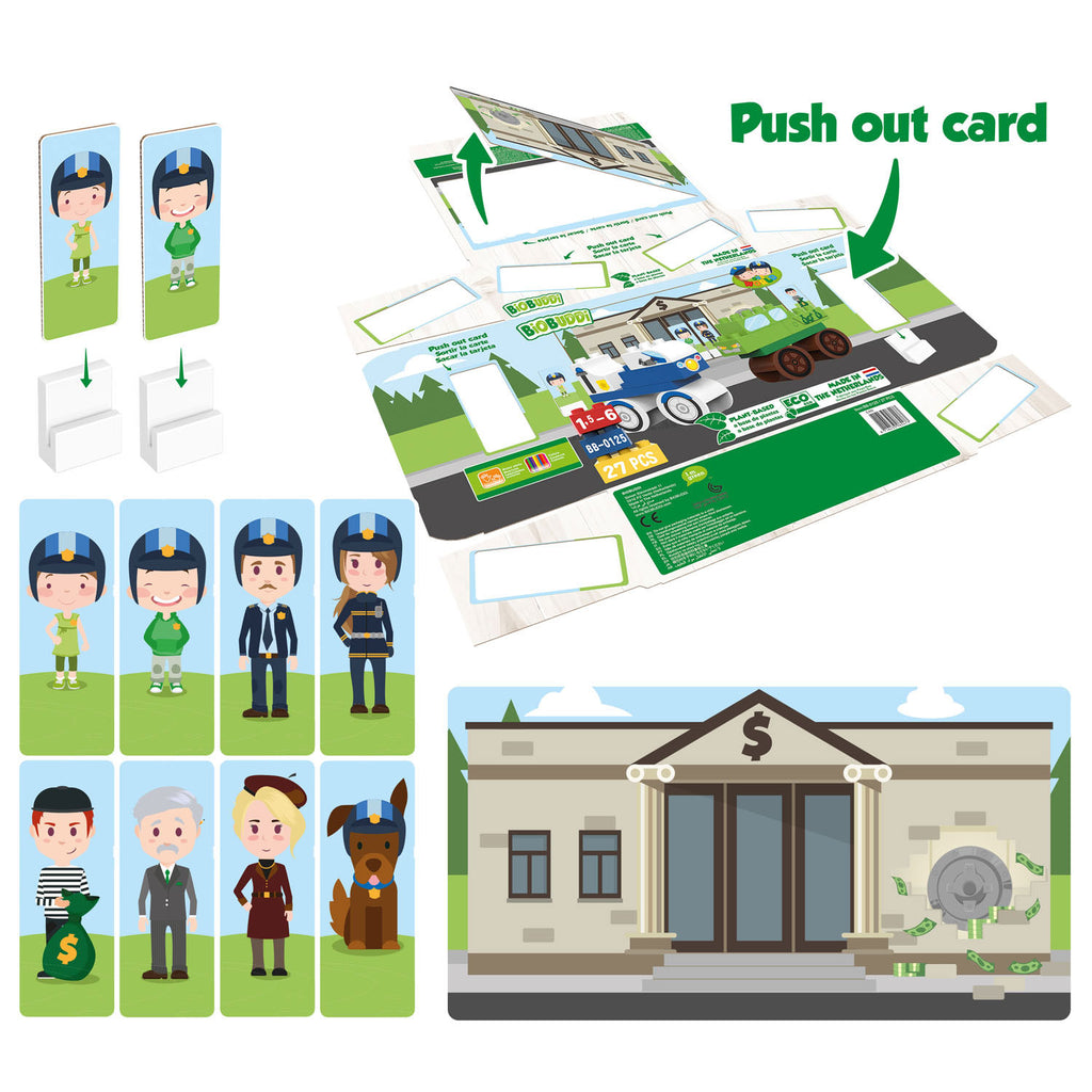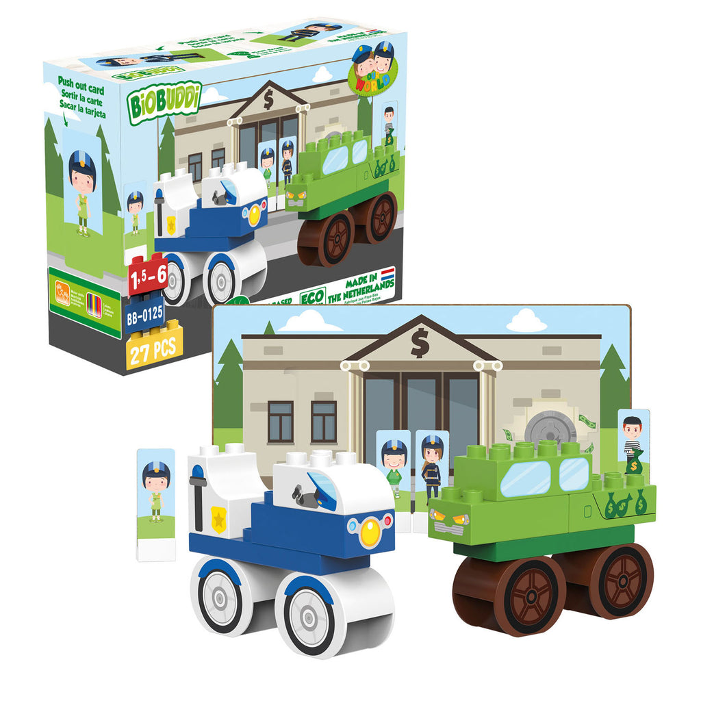 Spelen en bouwen met BiOBUDDi is nog nooit zo spannend geweest. De nieuwe BiOBUDDi speelset BANK zit bomvol met actie en plezier! 'Burgemeester! Burgemeester! er vind een overvalplaats!' Druk snel de twee dappere agenten uit de verpakking en ga achter de boef aan! Oh, nee de boef ontsnapt! Bouw de politiemotor, zet de politiesirene aan en race er oplos, kunnen we de boef pakken? De speelset BANK bestaat uit 27 verschillende onderdelen, gemaakt van resten uit de suikerrietplant. De blokken zijn milieuvriendelijk, recyclebaar, duurzaam en ook uitwisselbaar met andere merken. De verpakking is zo ontworpen dat het onderdeel uit het product maakt. Het is gemaakt van FCS-karton en met een simpele push kan je gemakkelijk verschillende kaartjes eruit halen en zetten in de bijgevoegde kaarthouders voor nog meer speelplezier. BiOBUDDi is gemaakt voor kinderen tussen de 1,5 en 6 jaar, Het helpt kinderen met het ontwikkelen van zowel motorische, cognitieve en creatieve vaardigheden tijdens het spelen en bouwen met BiOBUDDi.