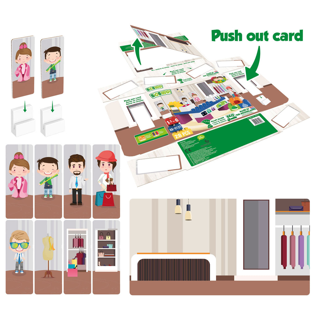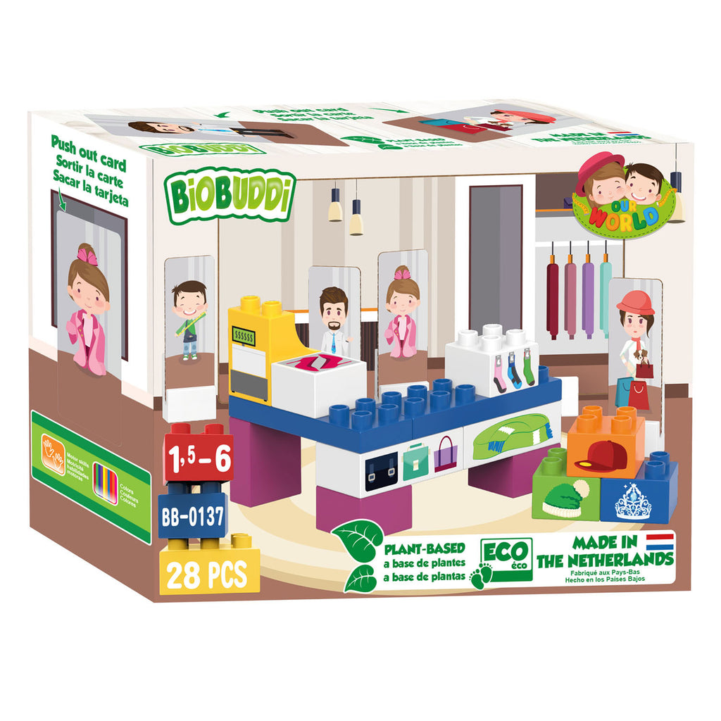 Bouw je eigen Fashion store, verkoop de mooiste kleren van de stad en wie weet lopen ze binnenkort met jouw kleren over de Catwalk. De leerzame en leuke speelset Fashion Winkel bevat 28 bouwblokken, 5 uitdrukkaartjes met nieuwe personages, zoals de getalenteerde stylist en zijn klanten, en een gloednieuwe achtergrond. Alle kaartjes zijn verwerkt in de 100% recyclebare verpakking! Onze bouwblokken zijn speciaal gemaakt door kinderen van 1,5 tot 6 jaar, gemaakt van resten uit de suikerrietplant. De blokken zijn milieuvriendelijk, recyclebaar, duurzaam en ook uitwisselbaar met andere merken. Het helpt kinderen met het ontwikkelen van zowel motorische, cognitieve als creatieve vaardigheden tijdens het spelen. Met BiOBUDDi laat je zien dat je verantwoord omgaat met de planeet en toekomst van de aarde. Daarnaast staat BiOBUDDi garant voor uren veilig en verantwoord speelplezier.