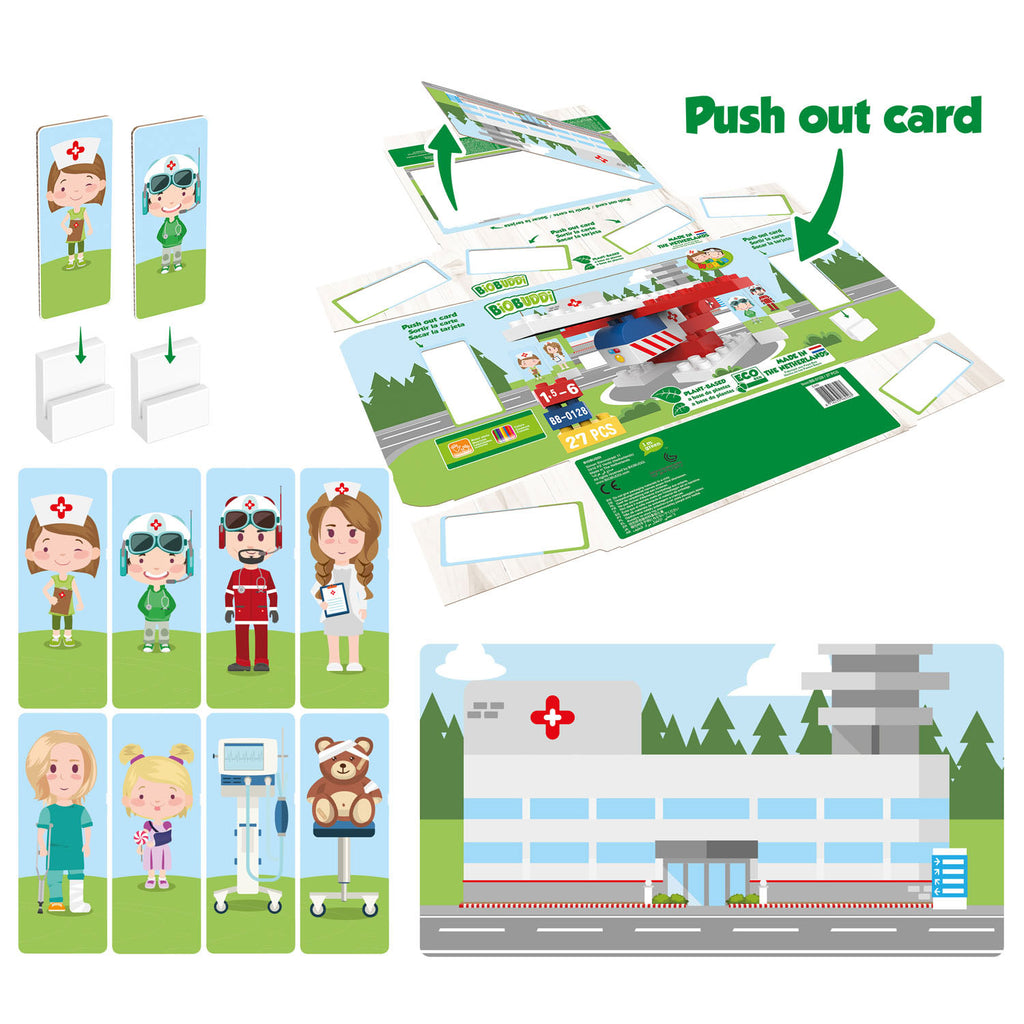 Bestuur je eigen Reddingshelikopter! Vlieg hoog in de lucht, ontwijk bomen, vlieg net boven de waterlaag. Laat met de RESCUE helikopter je vlieg talenten zien! "Burgemeester! Help, ik zit vast in de bergen!" Bouw snel de RESCUE-helikopter, hoog in de bergen en ga op zoek naar de bange burger, kan jij hem vinden? De speelset Rescue bestaat uit 40 verschillende onderdelen, gemaakt van resten uit de suikerrietplant. De blokken zijn milieuvriendelijk, recyclebaar, duurzaam en ook uitwisselbaar met andere merken. De verpakking is zo ontworpen dat het onderdeel uit het product maakt. Het is gemaakt van FSC-karton en met een simpele 'push' kan je gemakkelijk verschillende kaartjes eruit halen en zetten in de bijgevoegde kaarthouders voor nog meer speelplezier. BiOBUDDi is gemaakt voor kinderen tussen de 1,5 en 6 jaar, Het helpt kinderen met het ontwikkelen van zowel motorische, cognitieve en creatieve vaardigheden tijdens het spelen en bouwen met BiOBUDDi.