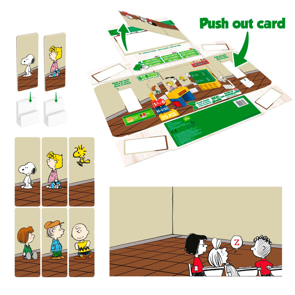 De Snoopy School van BiOBUDDi bestaat uit 25 onderdelen. Druk de achtergrond en de andere zeven uitdrukkaarten uit de 100% recyclebare verpakking en zet ze in de zes bijgeleverde sleufblokken.De bouwblokken van BiOBUDDi zijn milieuvriendelijk vervaardigd uit de niet bruikbare resten van de suikerrietplant.