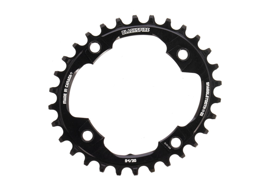 Het Ovaal Snaggletooth Narrow/Wide kettingblad voor gebruik met 4-gaats 94 mm BCD cranks. Deze Blackspire kettingbladen zijn CNC gefreesd van 7075-T6 aluminium voor een lange bediening. Gefreesd uit 0,190 ″ aluminium plaat voor licht gewicht en sterkte. 30T is uitgesneden uit 0,313 0,3 aluminium plaat. 30T functies: feitelijk nokken voor een perfecte kettinglijn van 49 mm. 30T is ook voorzien van schroefdraad voor M8 x 11 mm stalen bouten. Sterk en toch zeer licht van gewicht. Beschik over een ovaliteit van 12-13% met een timing van 115º na TDC (Top Dead Center). Voor gebruik in groepen met 9, 10, 11 of 12 versnellingen.